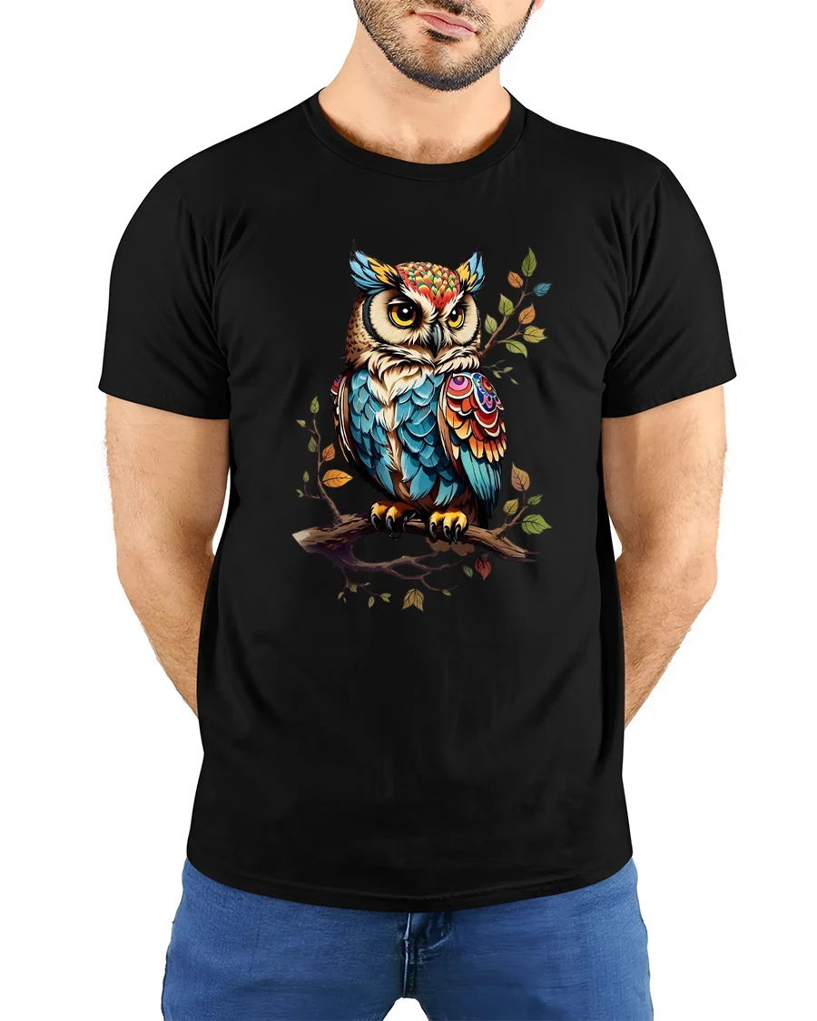 Colorful Owl Tee Artistic Feathered Owl Illustration Nature Art showcases a beautifully detailed owl perched with confidence and charm.