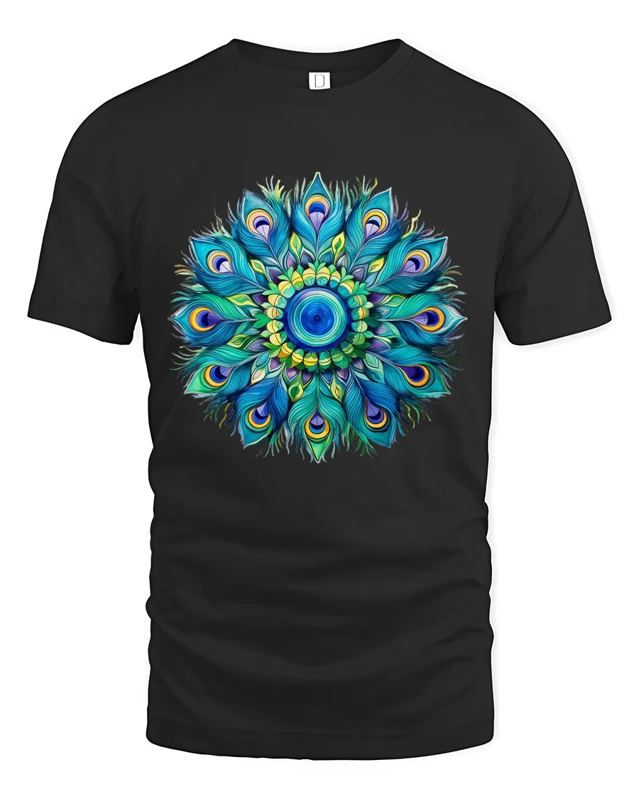 Colorful Peacock Mandala Graphic Tee showcases a mesmerizing fusion of peacock feathers and intricate mandala patterns.