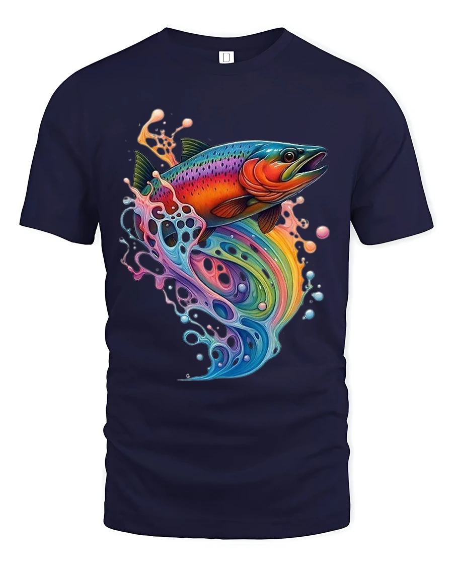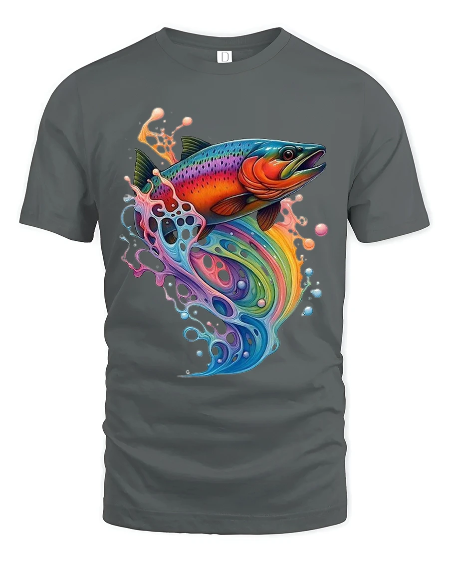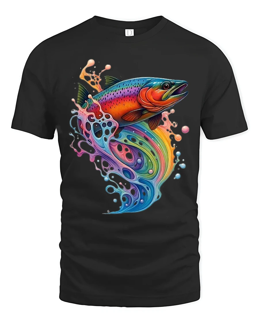 The Colorful Rainbow Fish Splash Graphic Tee With Artistic Flow Style captures attention with a stunning fusion of motion and color.