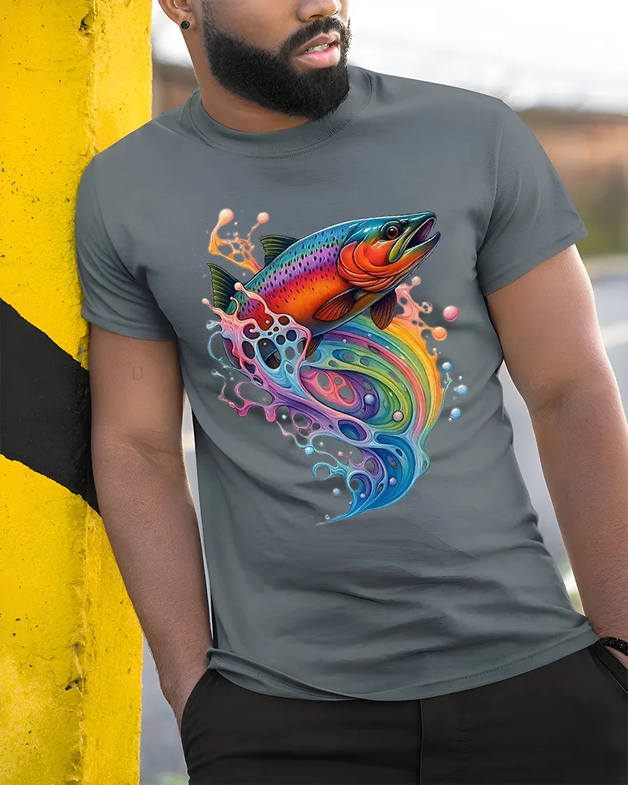 The Colorful Rainbow Fish Splash Graphic Tee With Artistic Flow Style brings creative confidence to everyday outfits.