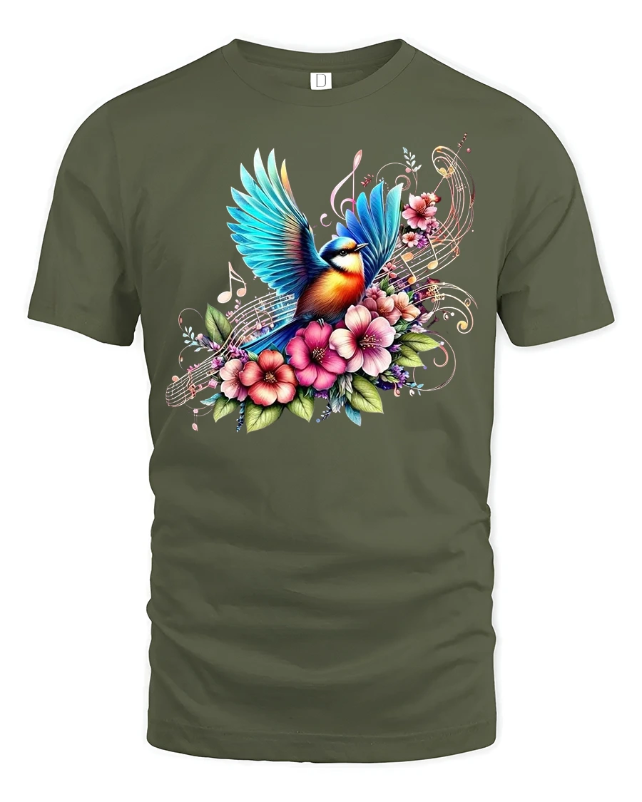 Colorful Songbird and Floral Music Notes Graphic Tee is a stunning blend of nature and melody that instantly brightens up your wardrobe. This eye-catching design features a vibrant bird in flight, surrounded by blooming flowers and flowing musical notes, creating a unique artistic masterpiece.