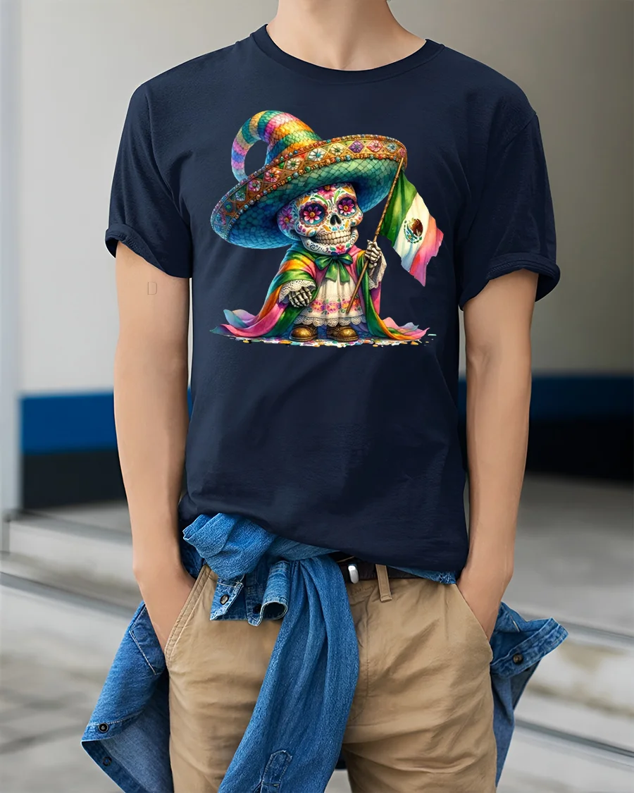This design features a detailed sugar skull wearing a colorful sombrero and traditional attire while proudly holding the Mexican flag.