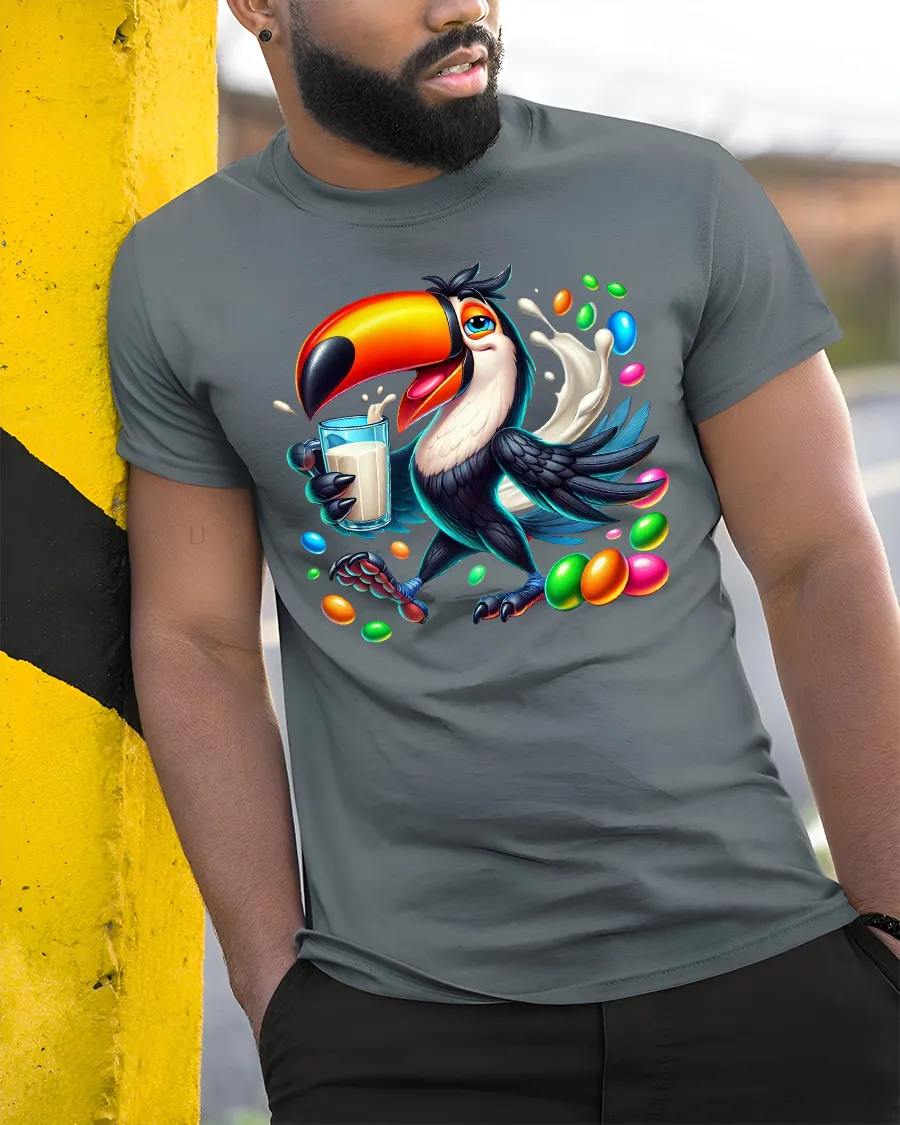 The Colorful Toucan Candy Splash Fun Art Graphic Tee brings tropical cheer and vibrant energy to your everyday style. Featuring a lively toucan holding a glass of milk surrounded by bright candy pieces and dynamic splashes, this eye-catching design celebrates color, playfulness, and upbeat personality. The artwork blends bold shades and smooth cartoon detailing to create a fun and expressive character that instantly lifts your mood.