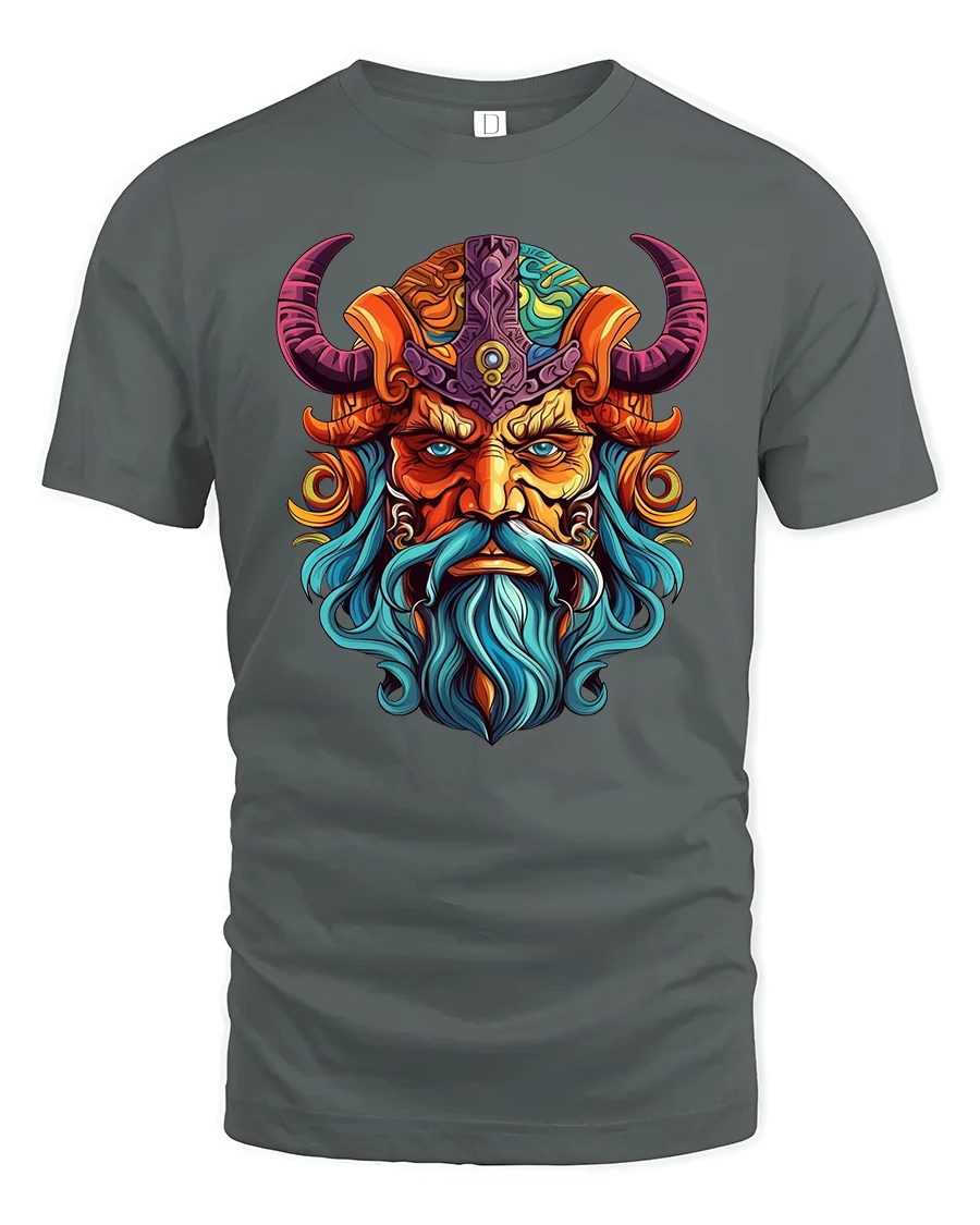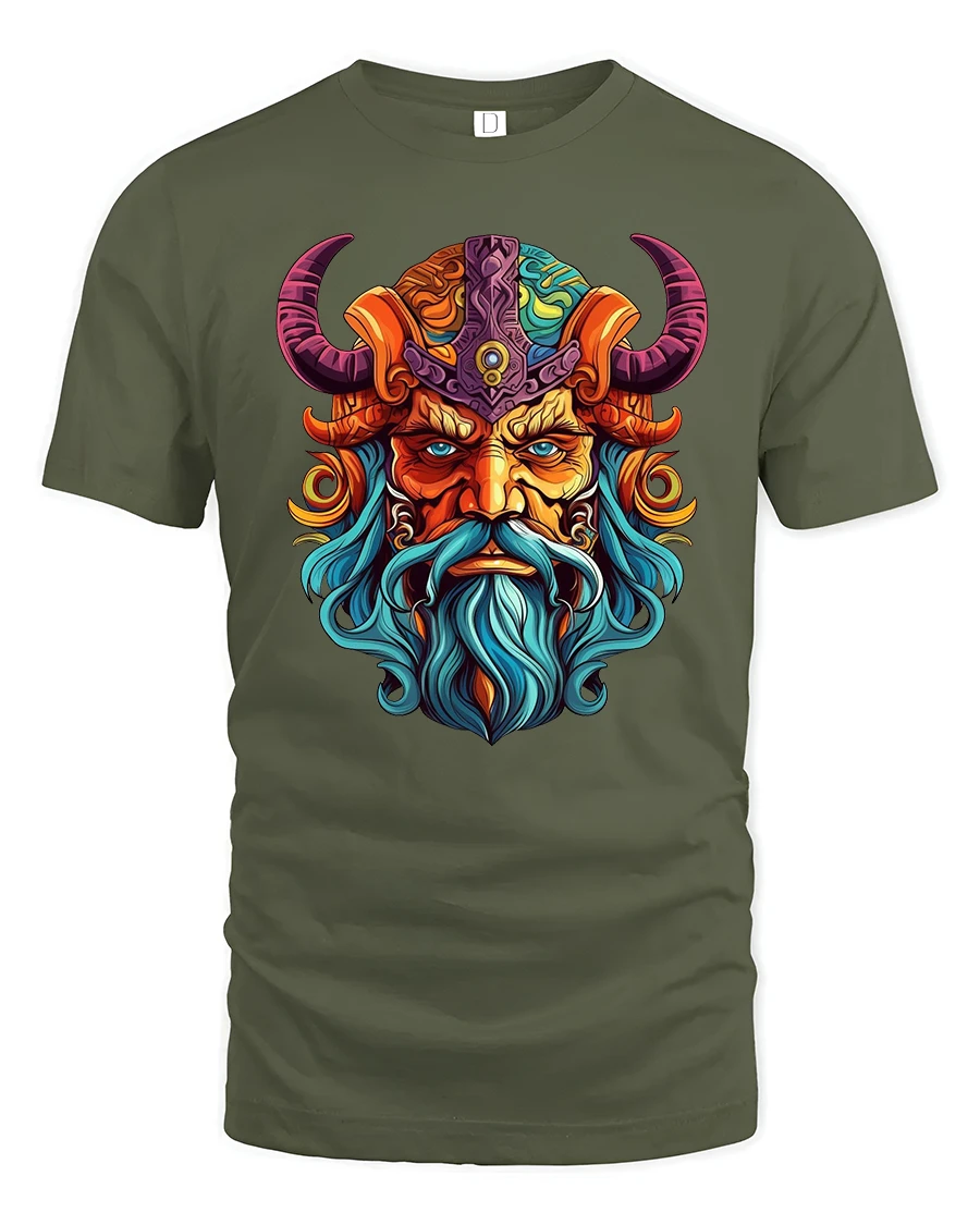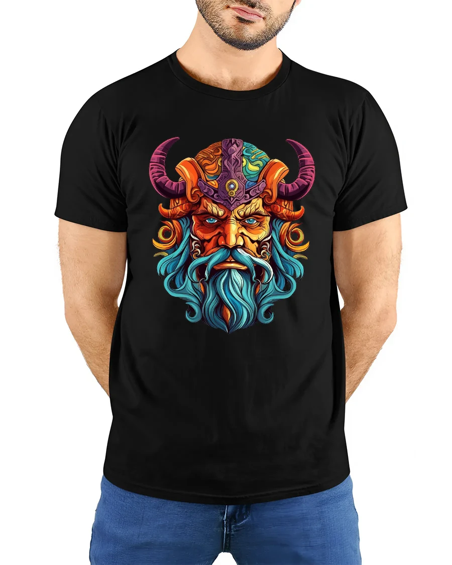 Unleash fearless energy with the Colorful Viking Warrior Face Graphic T Shirt. This striking design features a bold Norse inspired warrior with powerful horns, intense eyes, and a flowing beard brought to life in vivid colors. The detailed illustration captures the spirit of ancient legends, making this viking t shirt a powerful statement piece that reflects strength and individuality.