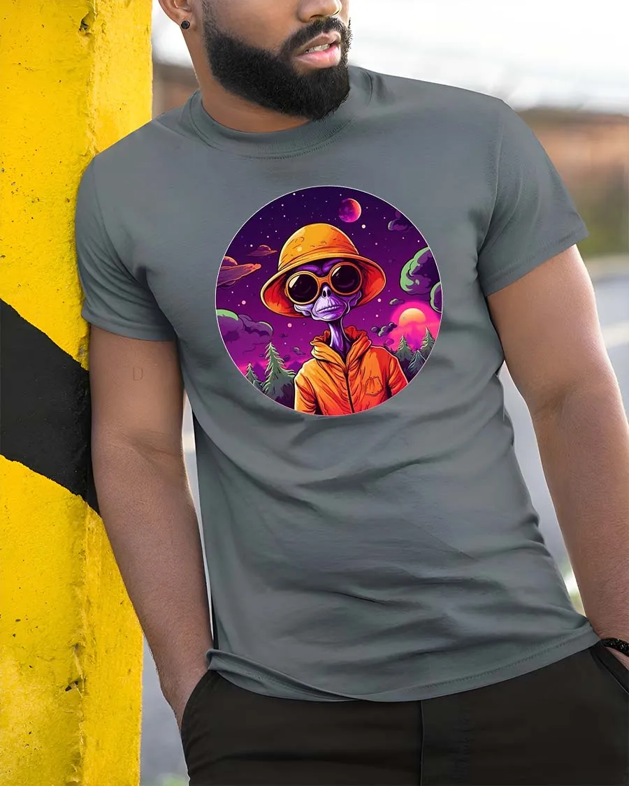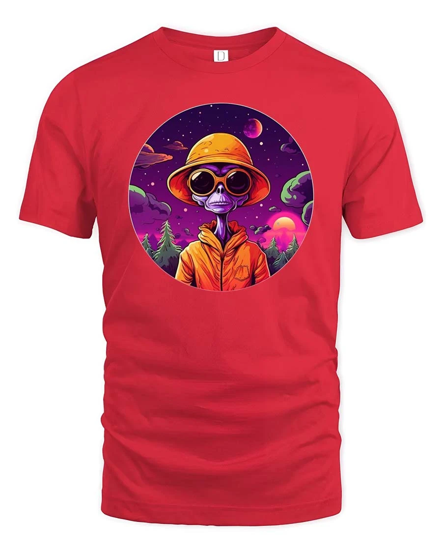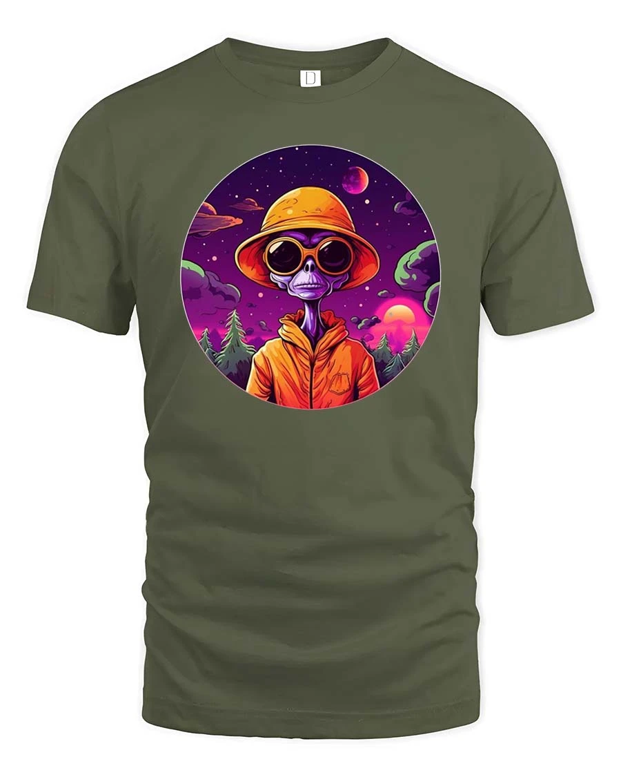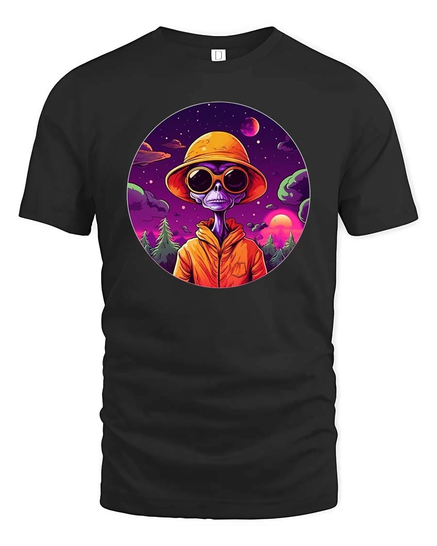 Cool Alien Sunset Graphic t-shirt Space Streetwear Tee features a vibrant cosmic illustration that blends futuristic style with artistic creativity.