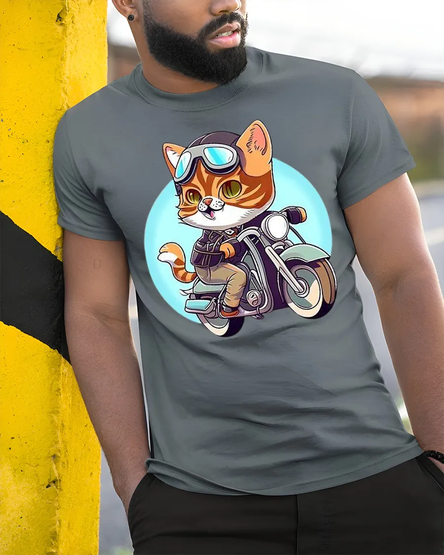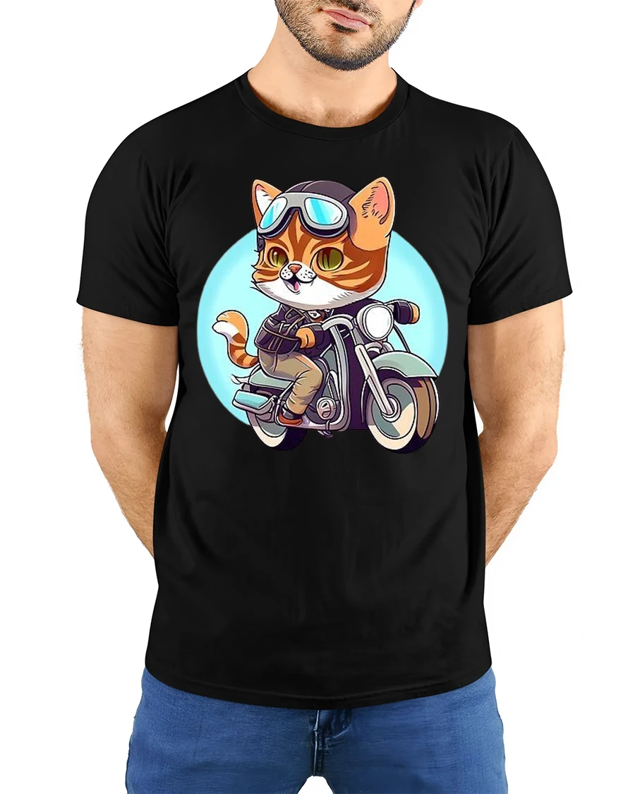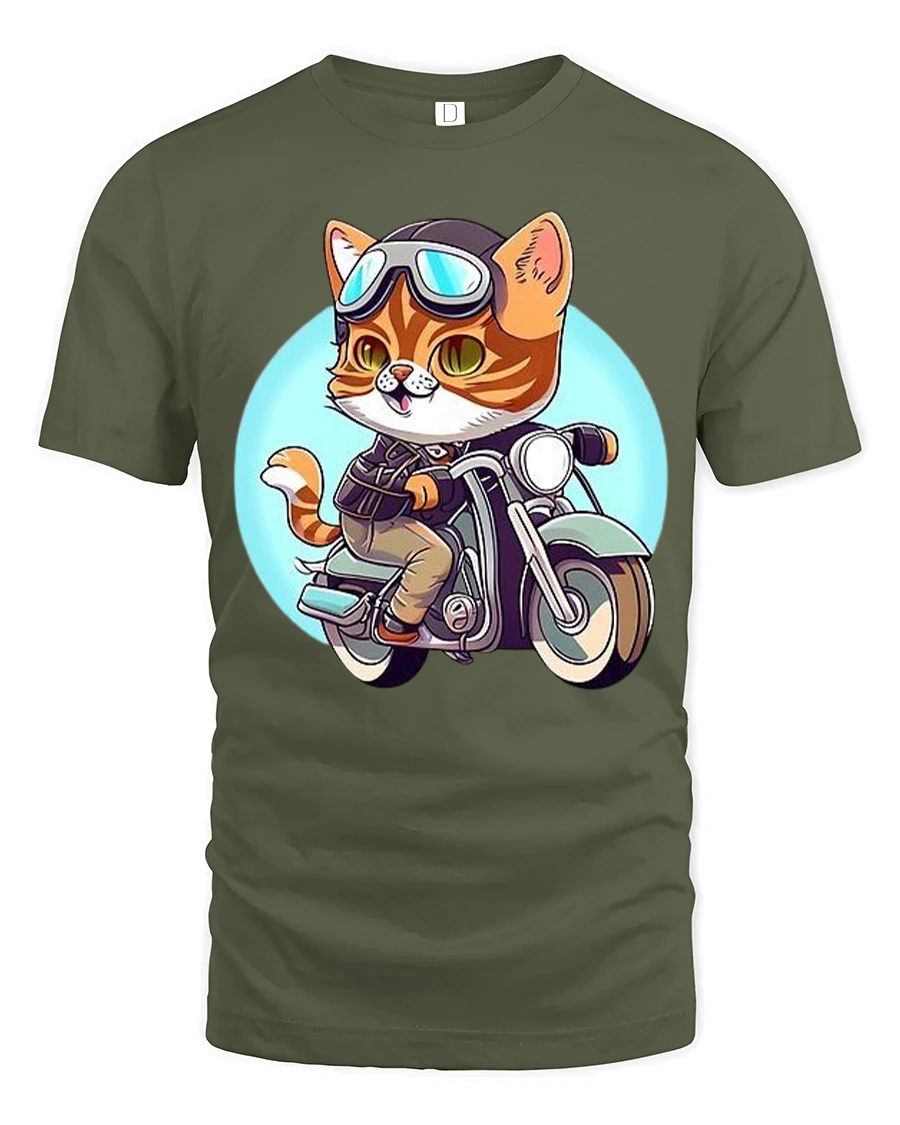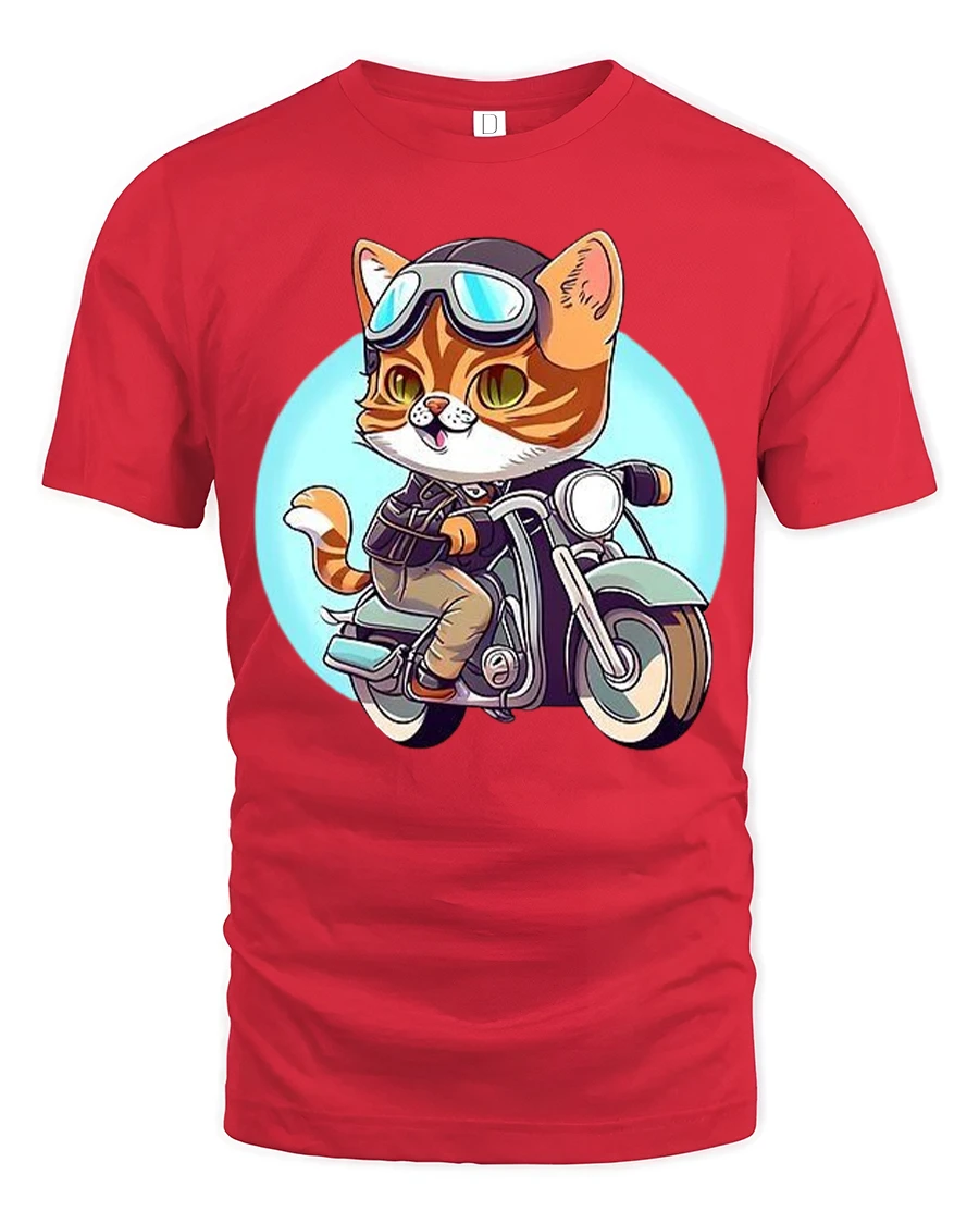 Our Cool Biker Cat Motorcycle Rider Cartoon Funny Graphic T-Shirt brings playful energy and hilarious style to your wardrobe. Featuring an adorable cat decked out in biker goggles and riding a classic motorcycle, this design blends cuteness with a cool rider attitude. The bright colors, expressive details, and fun cartoon artwork make this tee a standout piece for anyone who loves cats, motorcycles, or unique graphic designs.