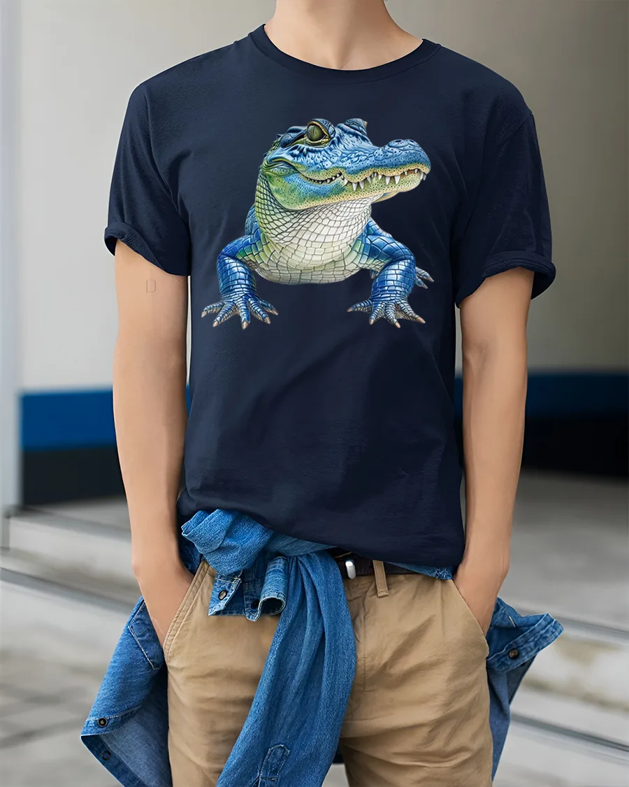 The artwork blends realism with cartoon charm, giving the gator a personality that feels both adventurous and adorable. The crisp detailing on the scales and the dynamic posture add depth, making this tee an excellent statement piece for casual outings, relaxed weekends, or any day you want your outfit to feel more exciting and expressive.