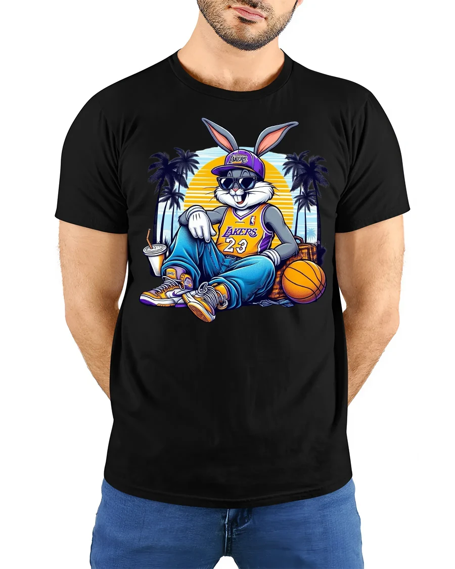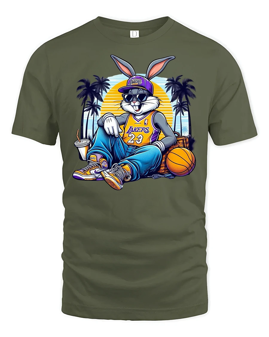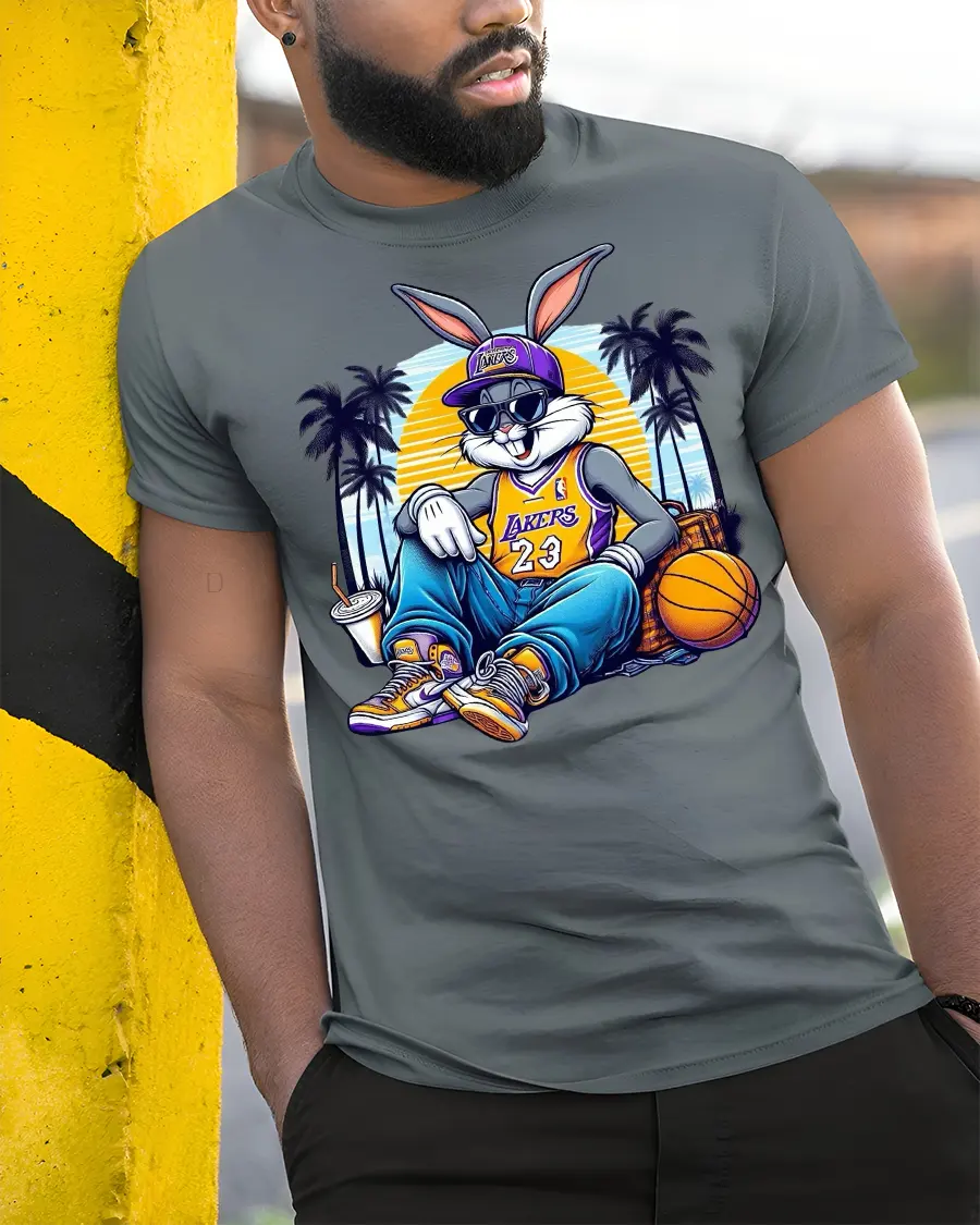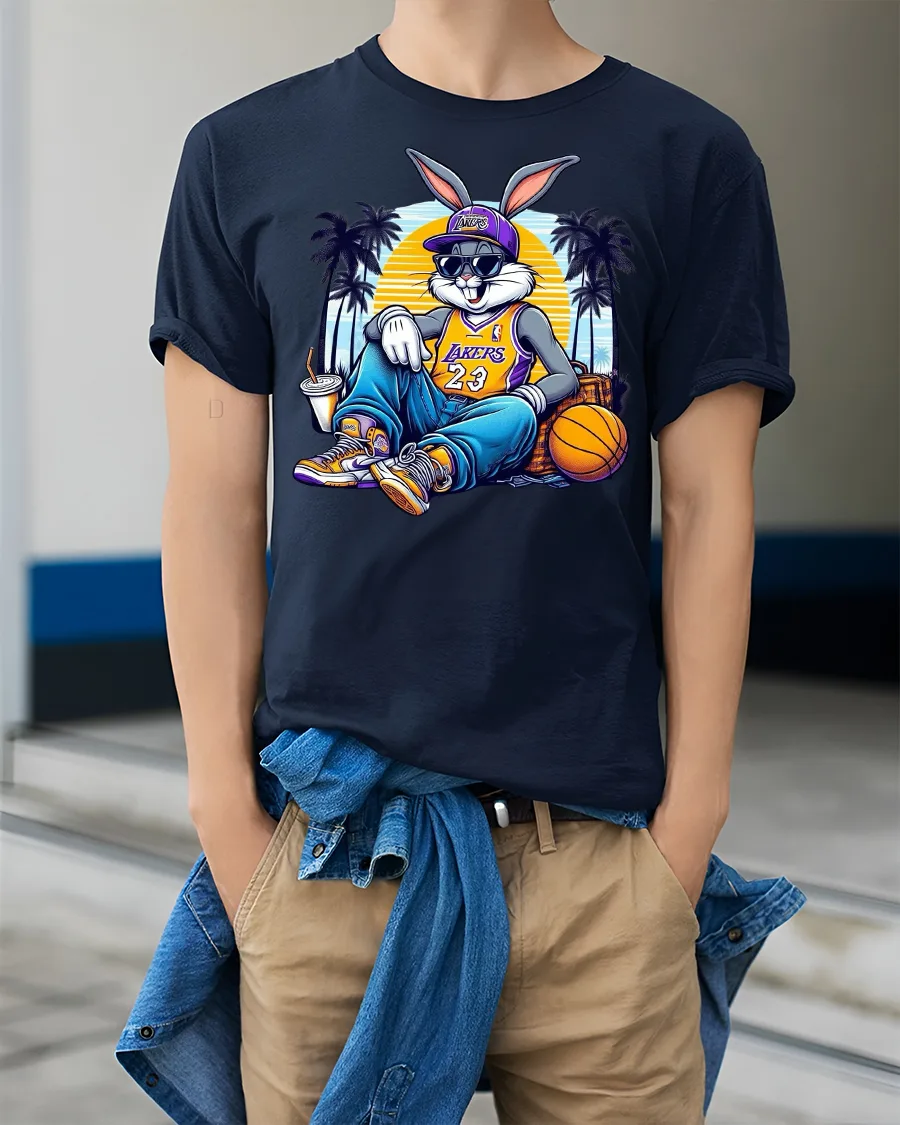 Cool Bunny Basketball Streetwear Graphic Printed Tee is the ultimate pick for those who love hoops, humor, and bold designs. Featuring a chill bunny dressed in a basketball jersey, sneakers, and shades, this shirt captures the perfect mix of streetwear and sporty fun. The retro sunset and palm trees in the background make it a standout graphic full of summer vibes.