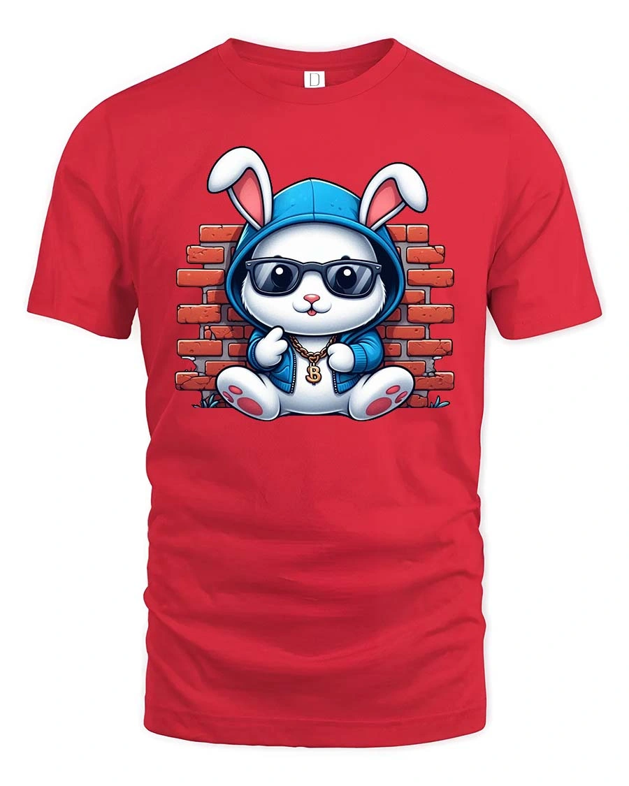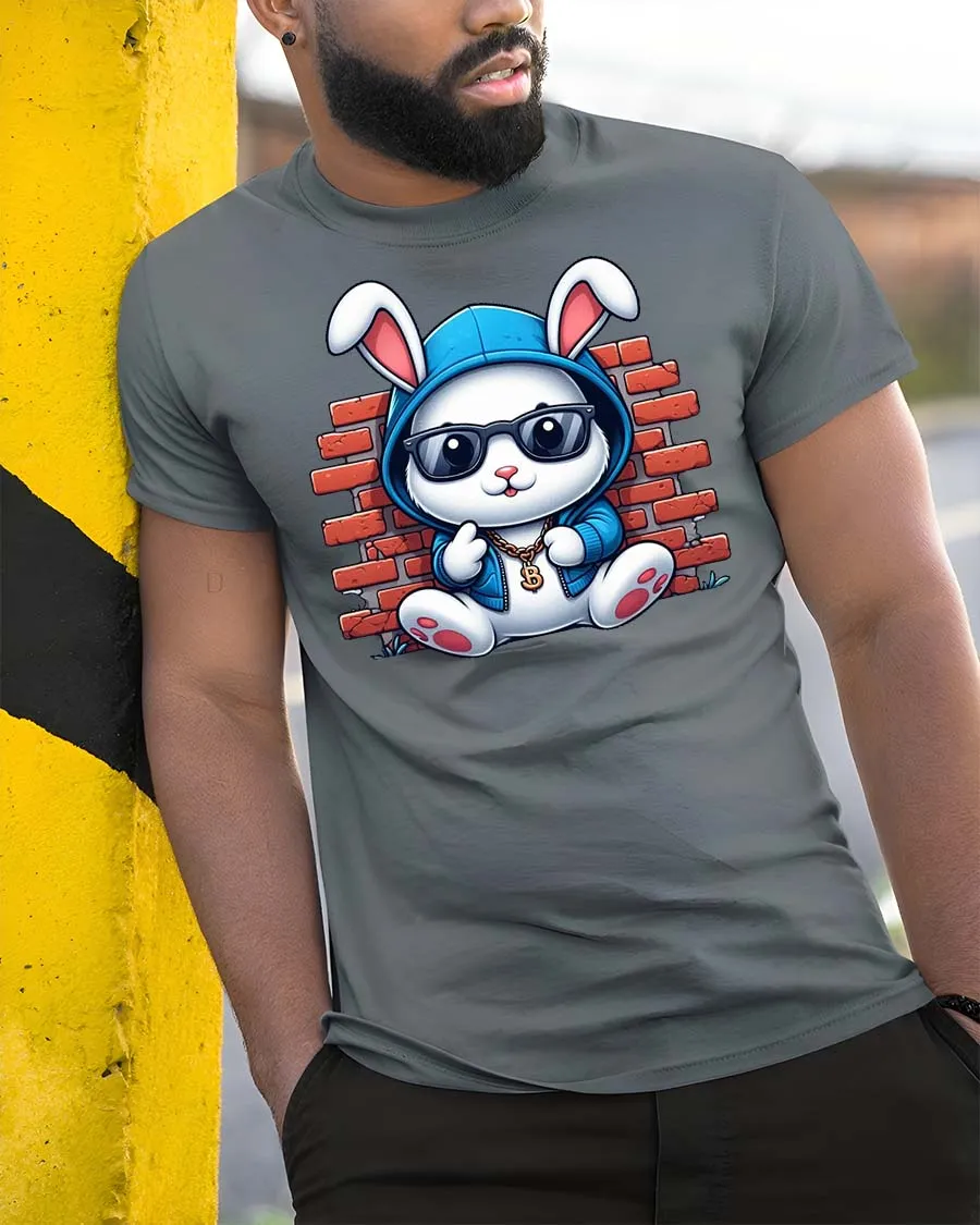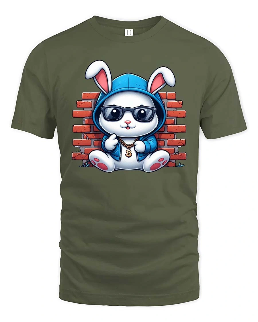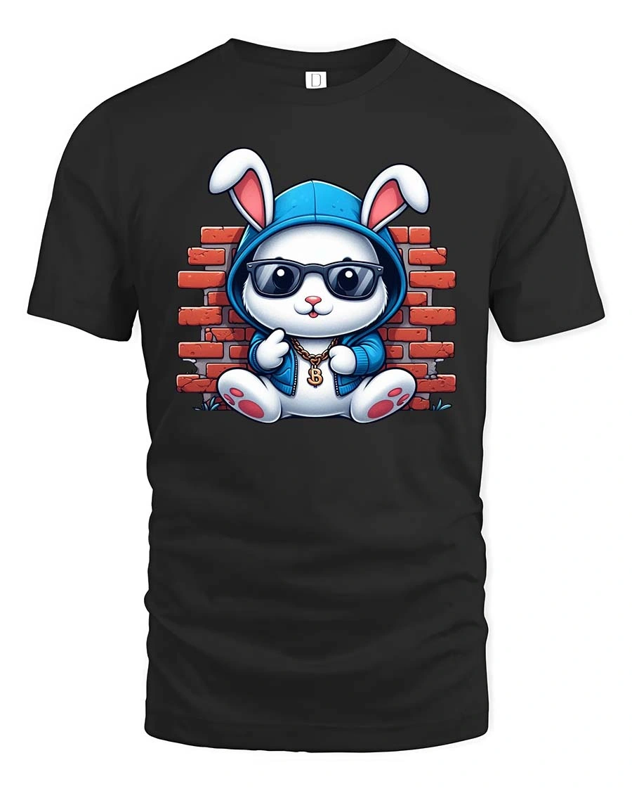 Cool Bunny Street Style Graphic T-Shirt features an adorable rabbit rocking sunglasses, a hoodie, and a bold streetwear vibe. Set against a brick wall backdrop, this cool bunny t-shirt blends cute cartoon charm with urban hip hop style. The playful details and confident attitude make this design perfect for anyone who loves fun fashion with personality.