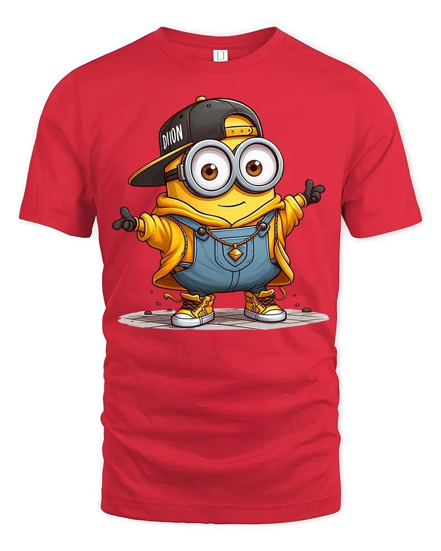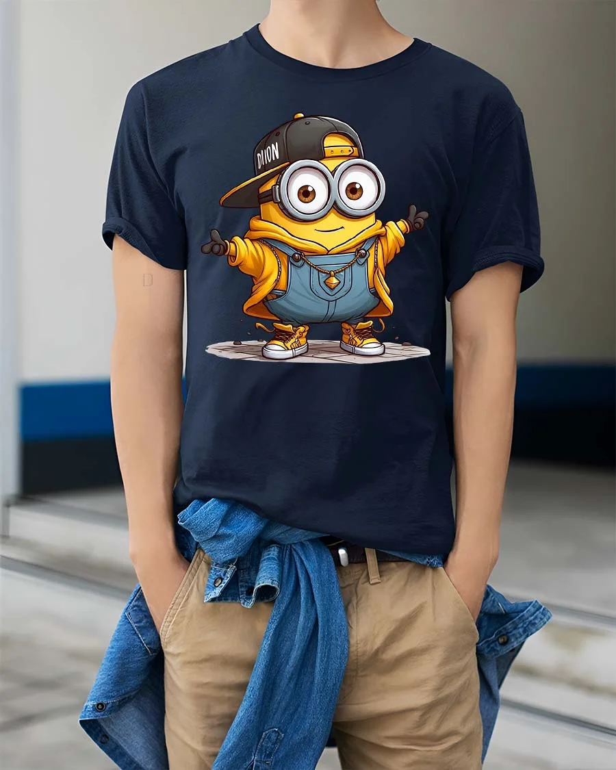 Cool Cartoon Minion Style T-Shirt Funny Yellow Character Tee features a playful yellow cartoon character dressed in trendy streetwear with a cap and hoodie.