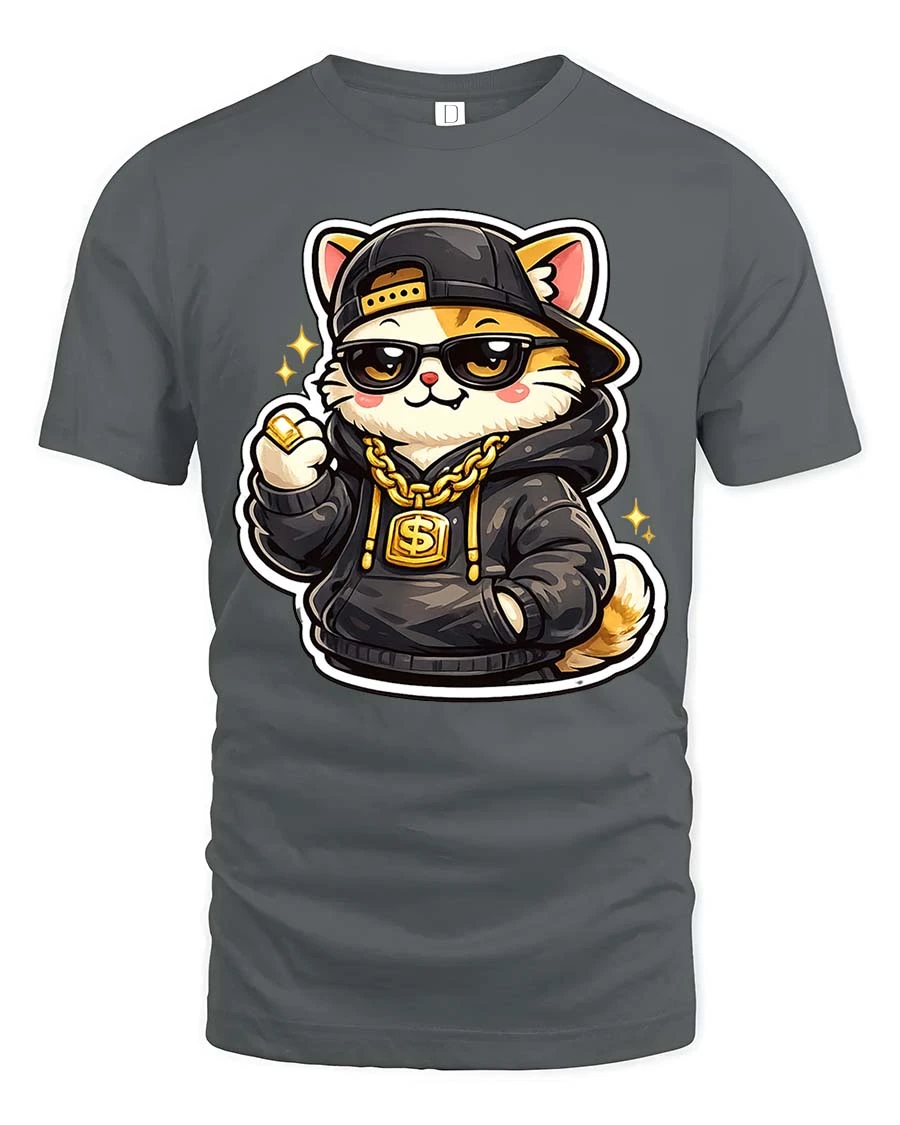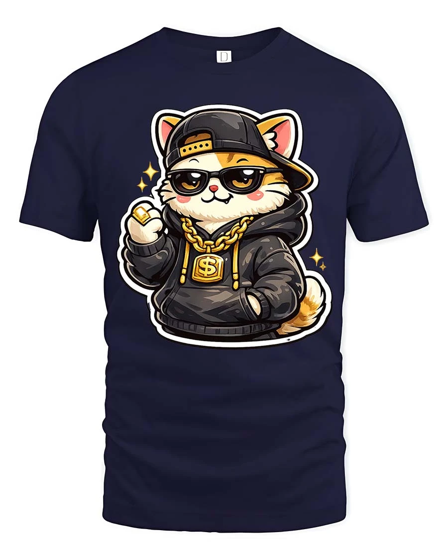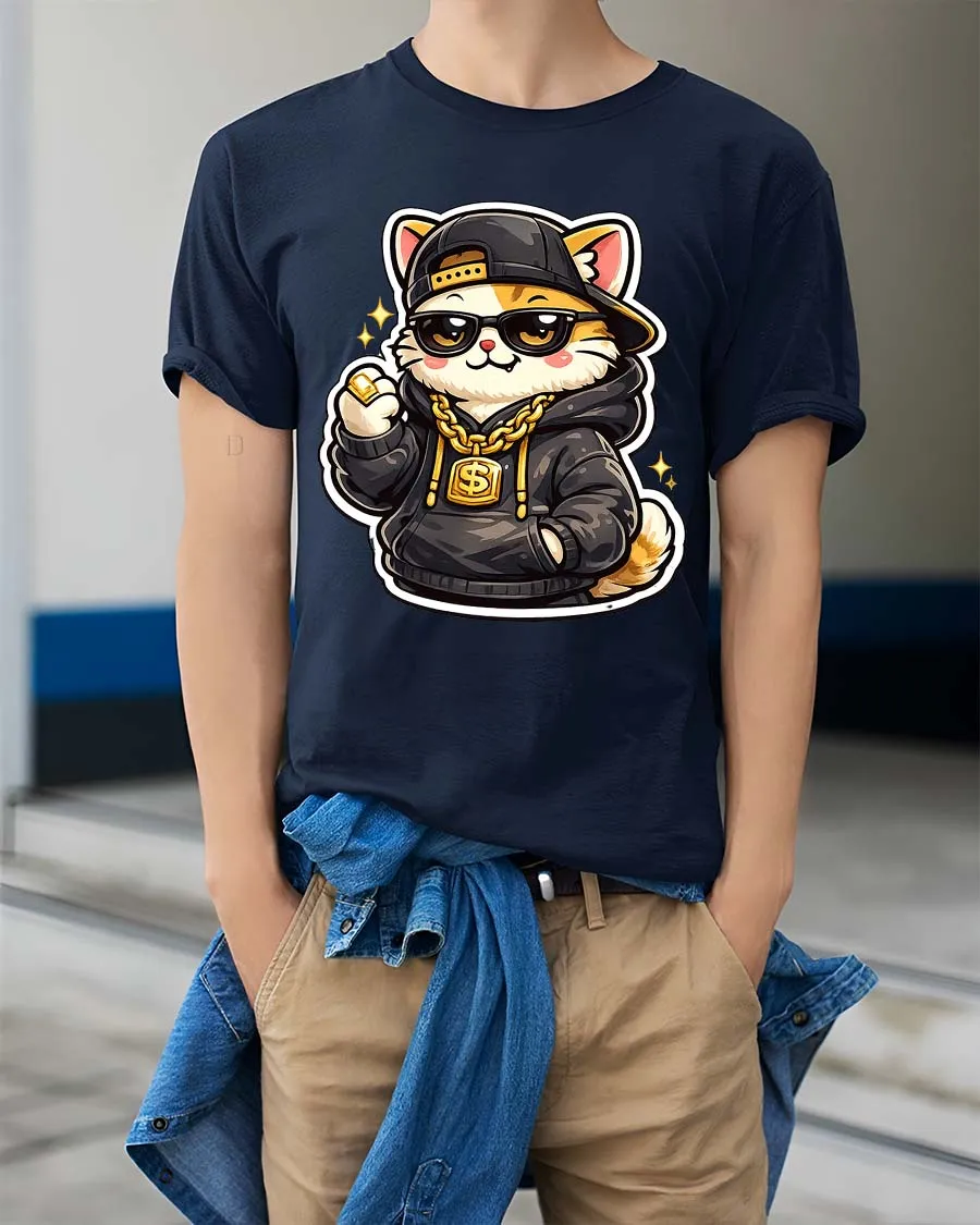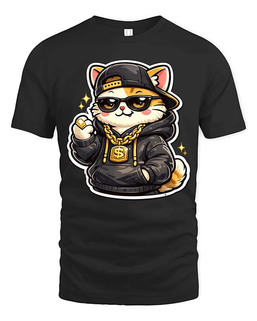 Featuring a stylish cat wearing a cap, hoodie, sunglasses, and gold chain, this eye-catching graphic adds personality and confidence to any casual outfit.