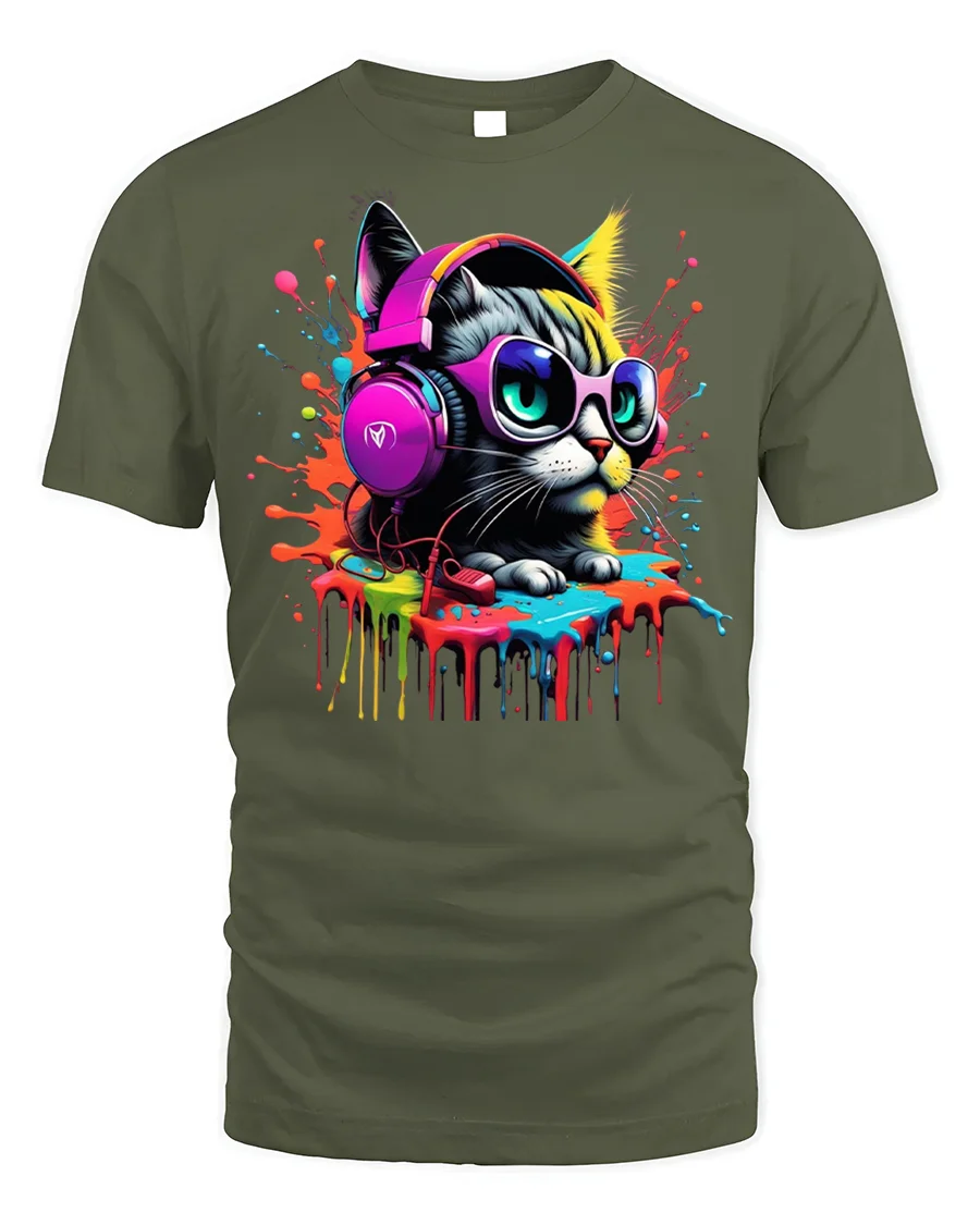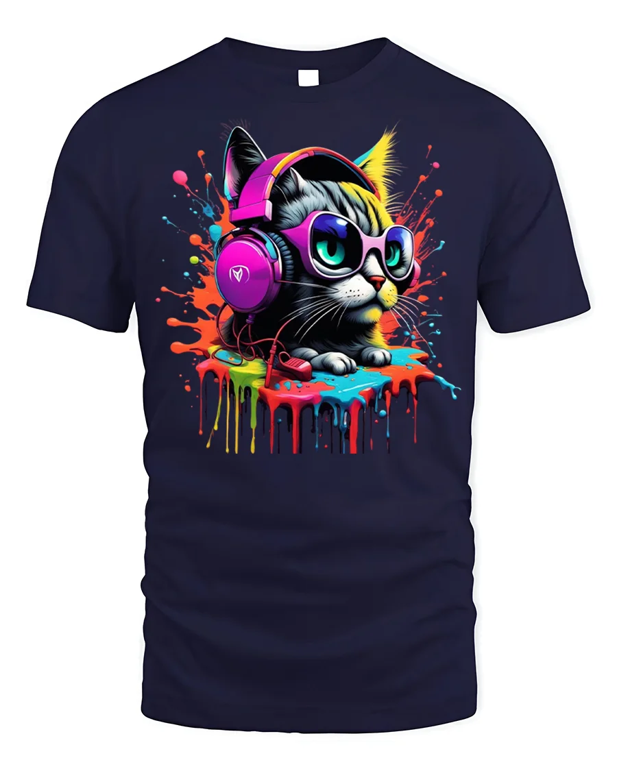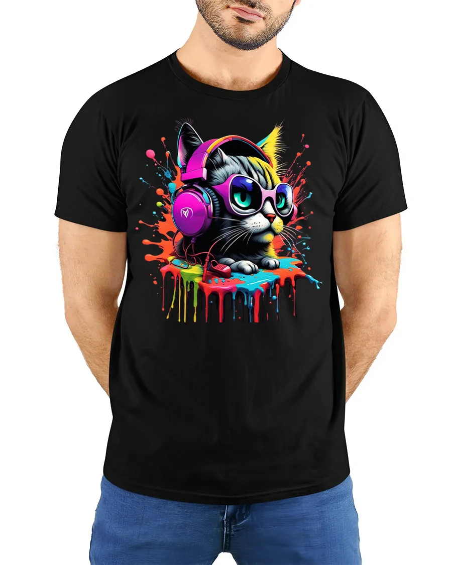 Add a splash of attitude and color to your outfit with the Cool Cat T-shirt with Headphones and Paint Splash, the ultimate statement tee for cat lovers with style.