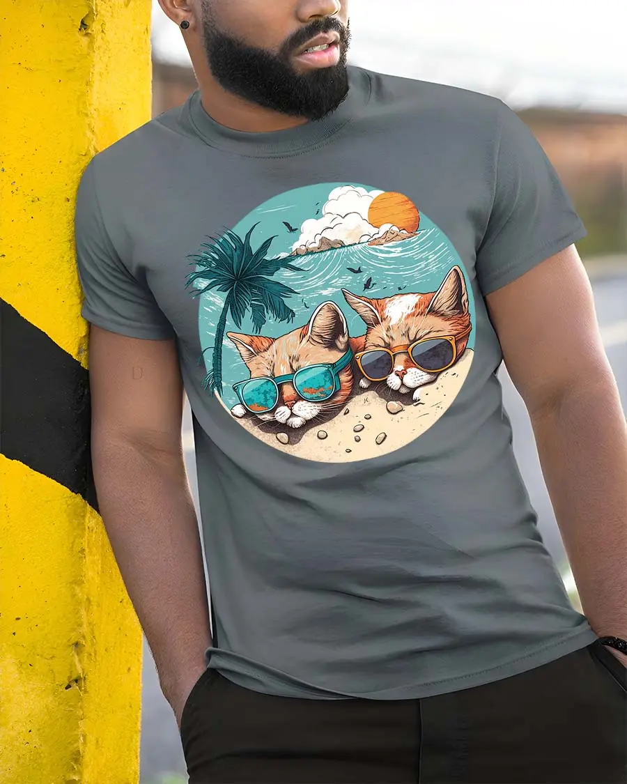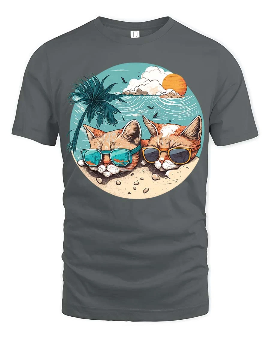Featuring two chill cats wearing sunglasses by the beach with a tropical sunset backdrop, this t-shirt captures a laid-back summer mood.