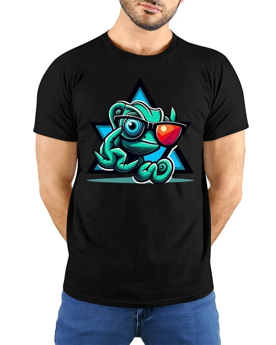 Designed for comfort and casual wear, this t-shirt offers a soft cotton feel with a relaxed classic fit that pairs easily with jeans, shorts, or everyday streetwear. The vibrant chameleon illustration pops against the dark background, highlighting the stylish sunglasses and eye-catching design. Whether you’re hanging out with friends, exploring the outdoors, or simply showing your love for reptiles, this graphic tee adds a fun and confident vibe to your outfit.