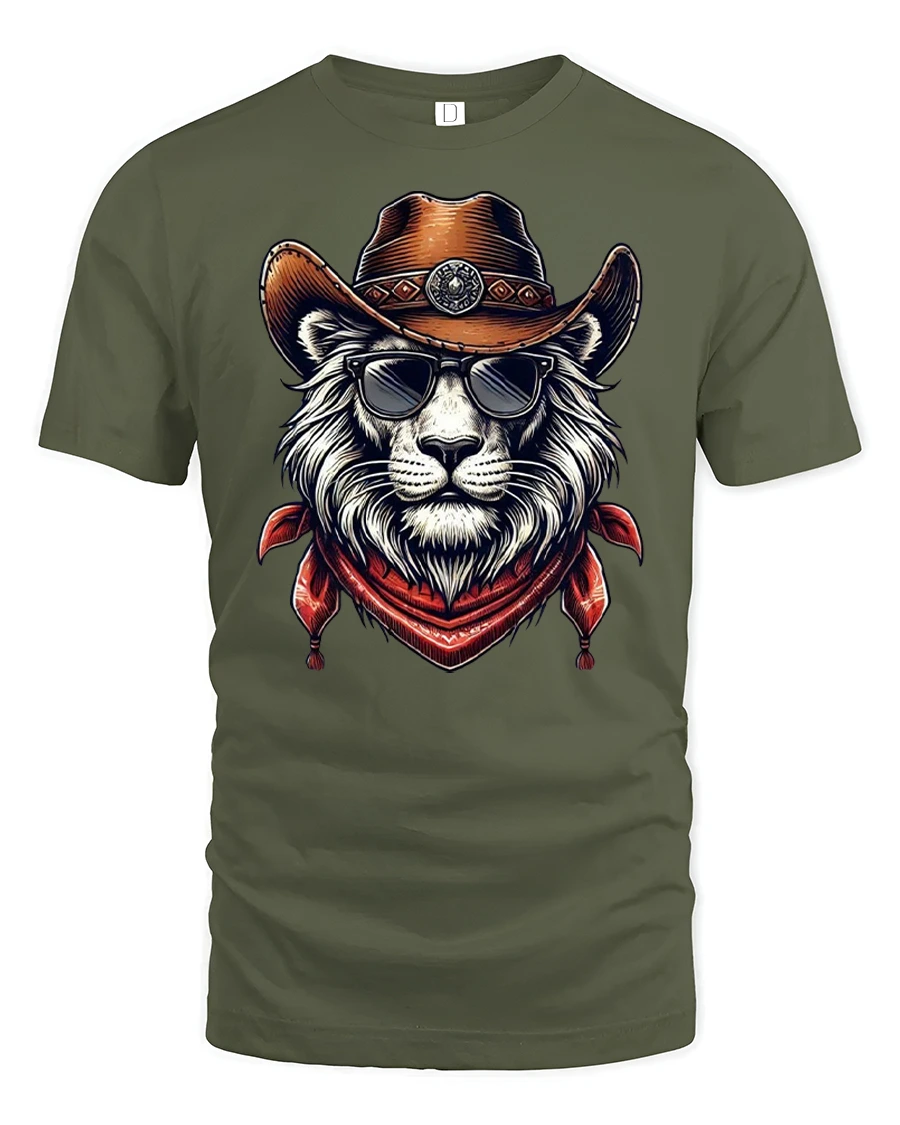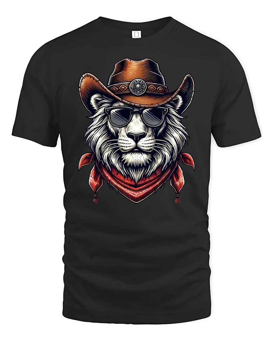 Featuring a majestic lion in full cowboy gear — complete with a hat, sunglasses, and red bandana — this design perfectly blends wild strength and western coolness.