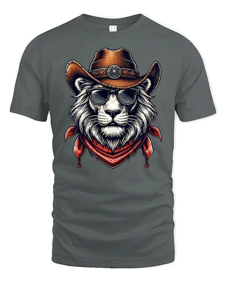 The Cool Cowboy Lion Sunglasses Western Style Graphic Tee is crafted from soft, breathable cotton for all-day comfort.