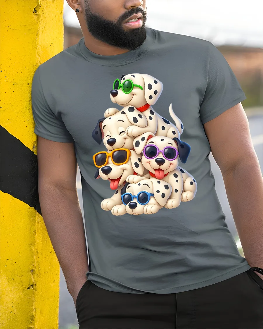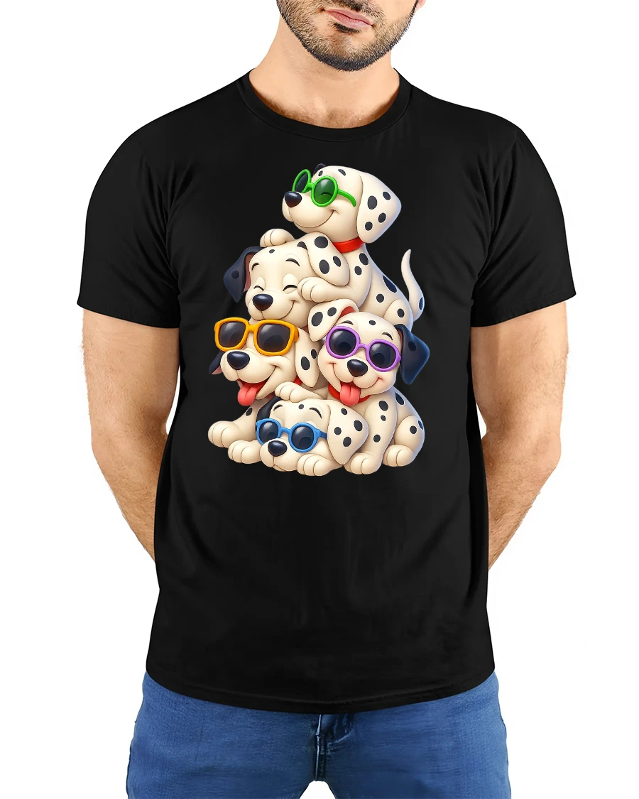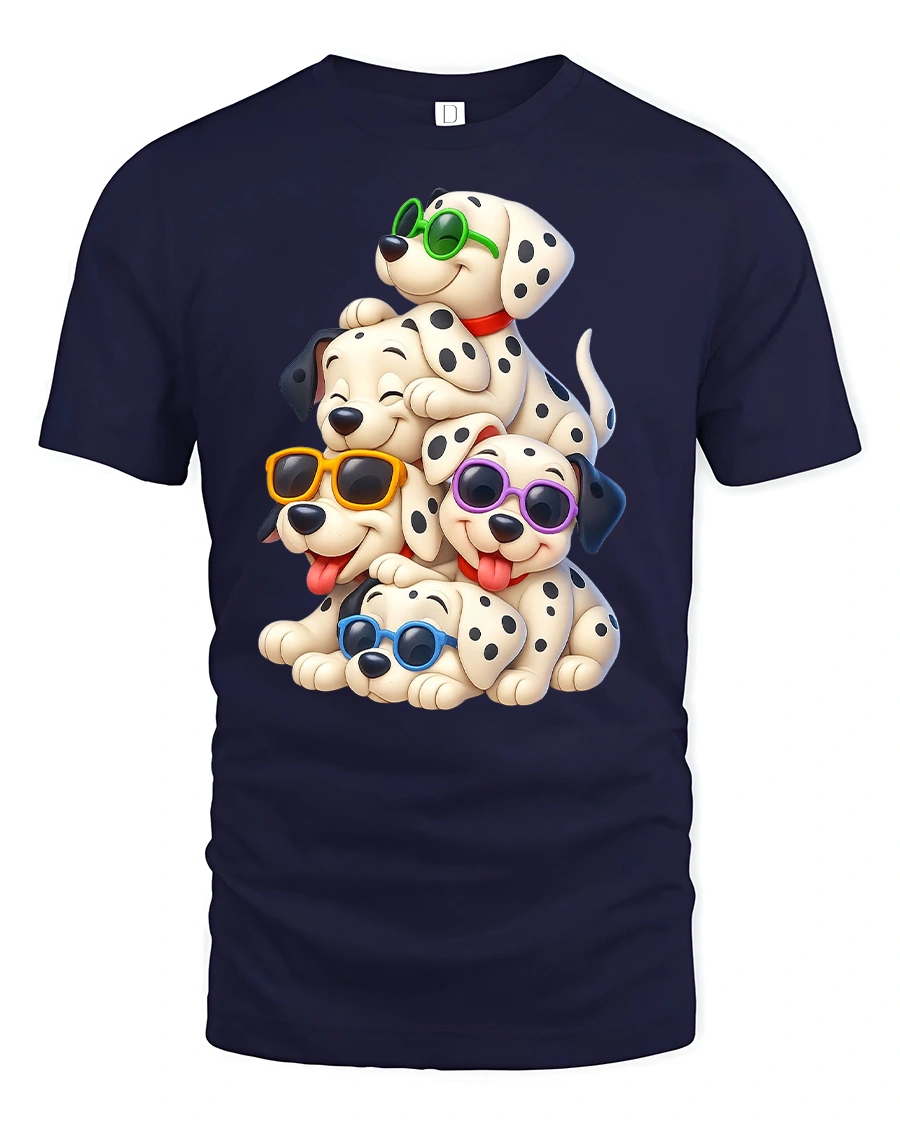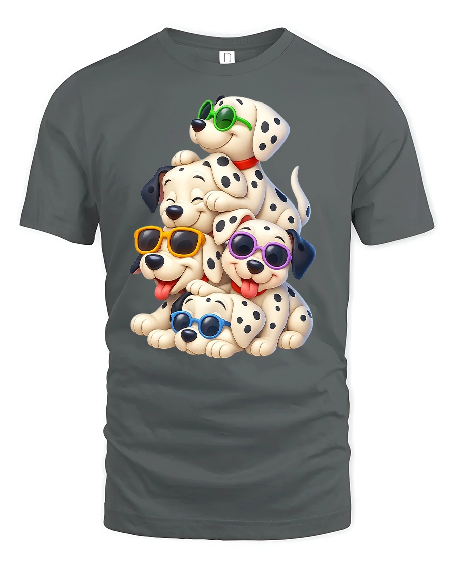 This Cool Dalmatian Puppies Tee with Fun Sunglasses Cartoon Art brings pure joy and playful charm to any outfit. Featuring an adorable stack of Dalmatian puppies wearing brightly colored sunglasses, the design blends fun personality with a vibrant cartoon style that instantly grabs attention. Each pup has a unique expression, adding to the overall delight and making this tee a standout favorite among animal lovers.