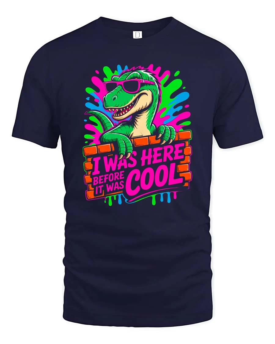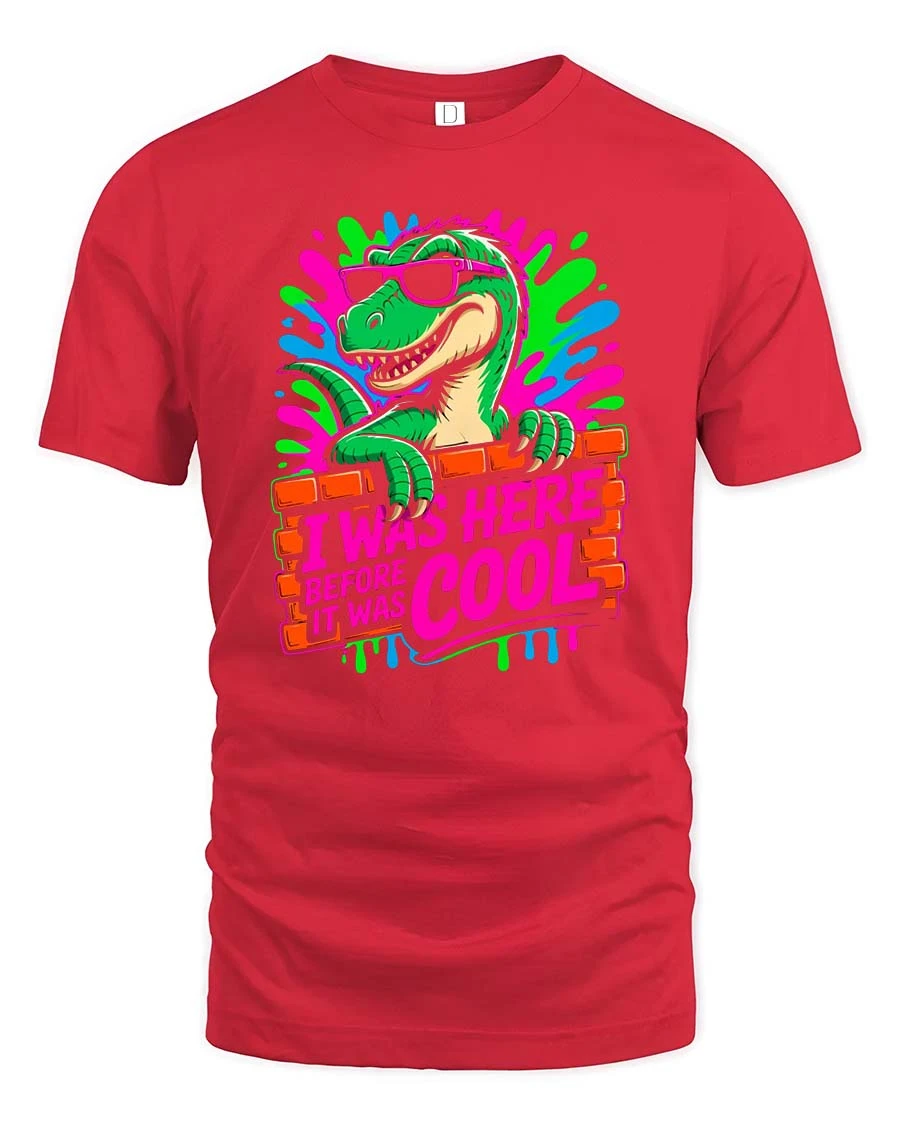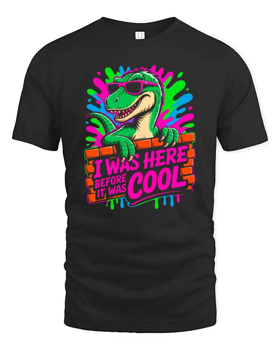 Featuring a stylish dinosaur with sunglasses and vibrant neon splashes, this graphic stands out with a playful retro vibe.