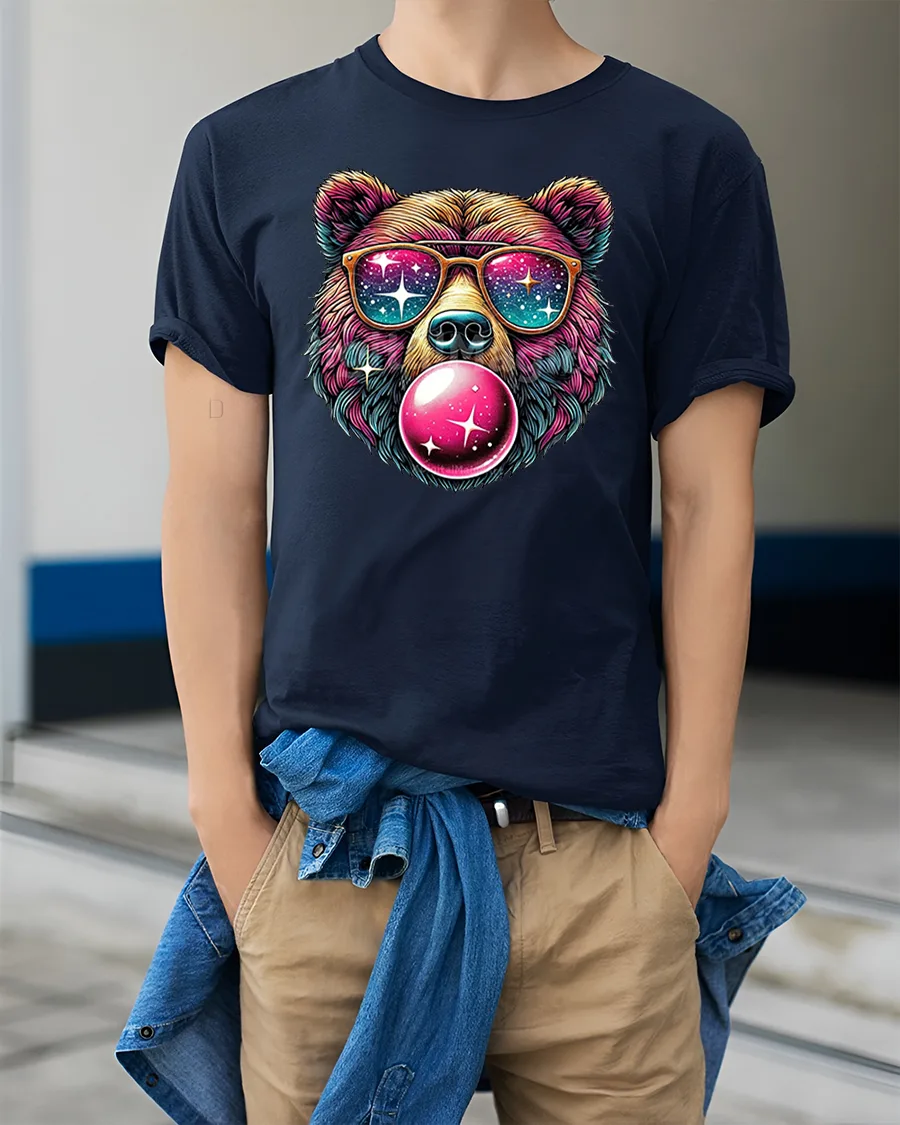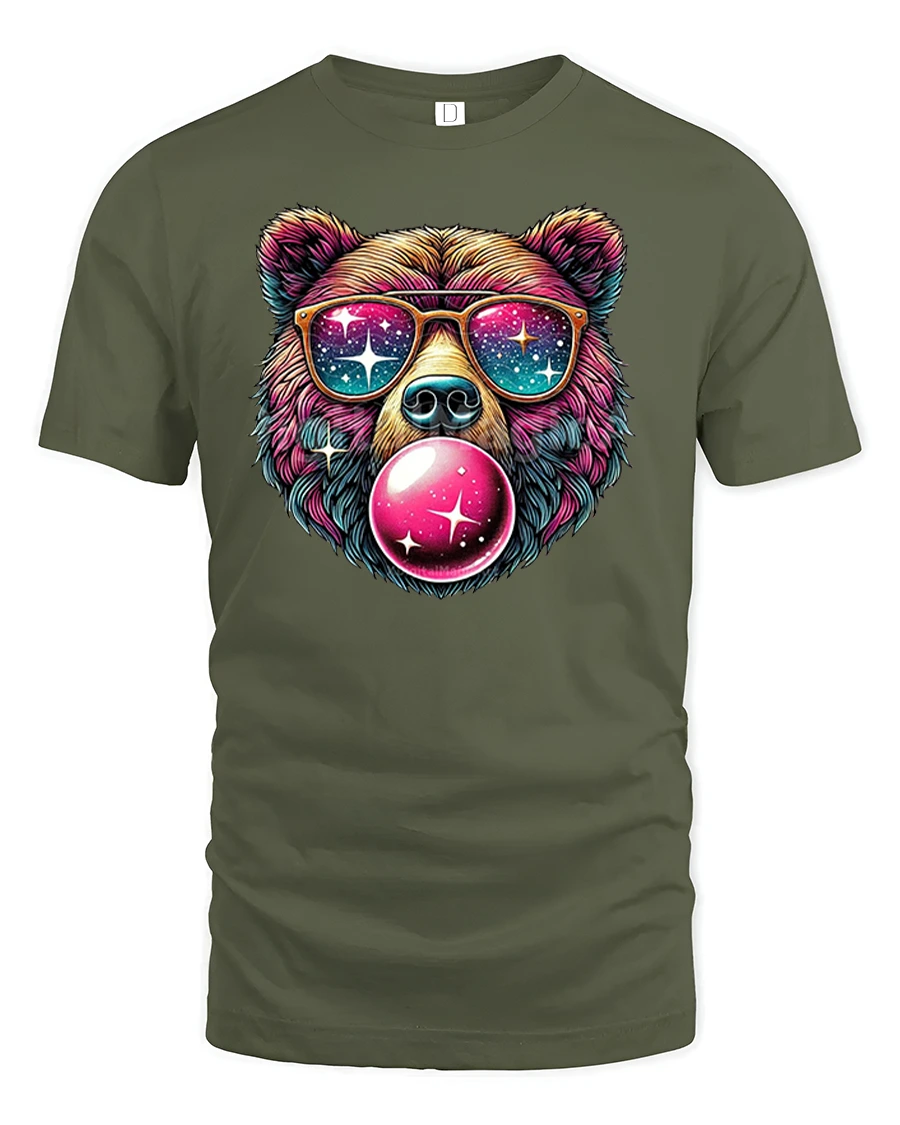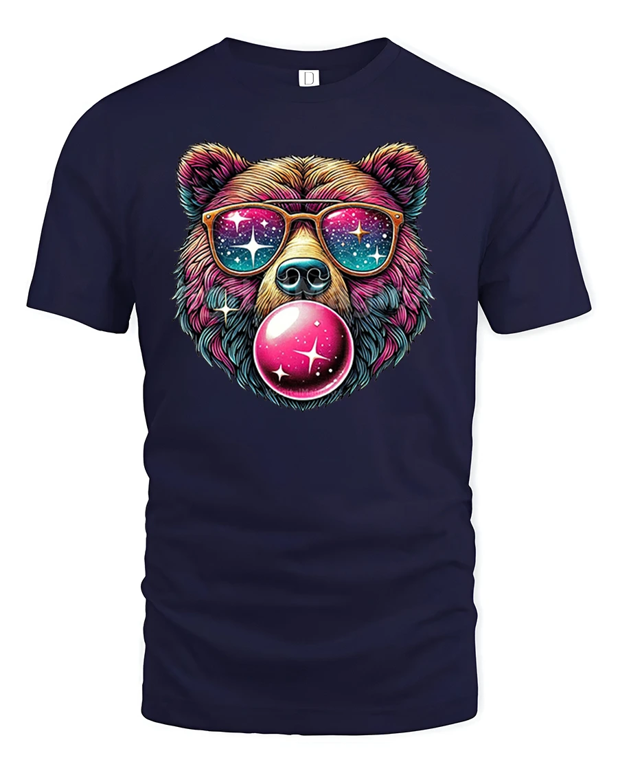 Featuring a vibrant bear blowing bubblegum with a galaxy reflected in its sunglasses, this shirt brings fun energy and eye-catching color to any outfit.