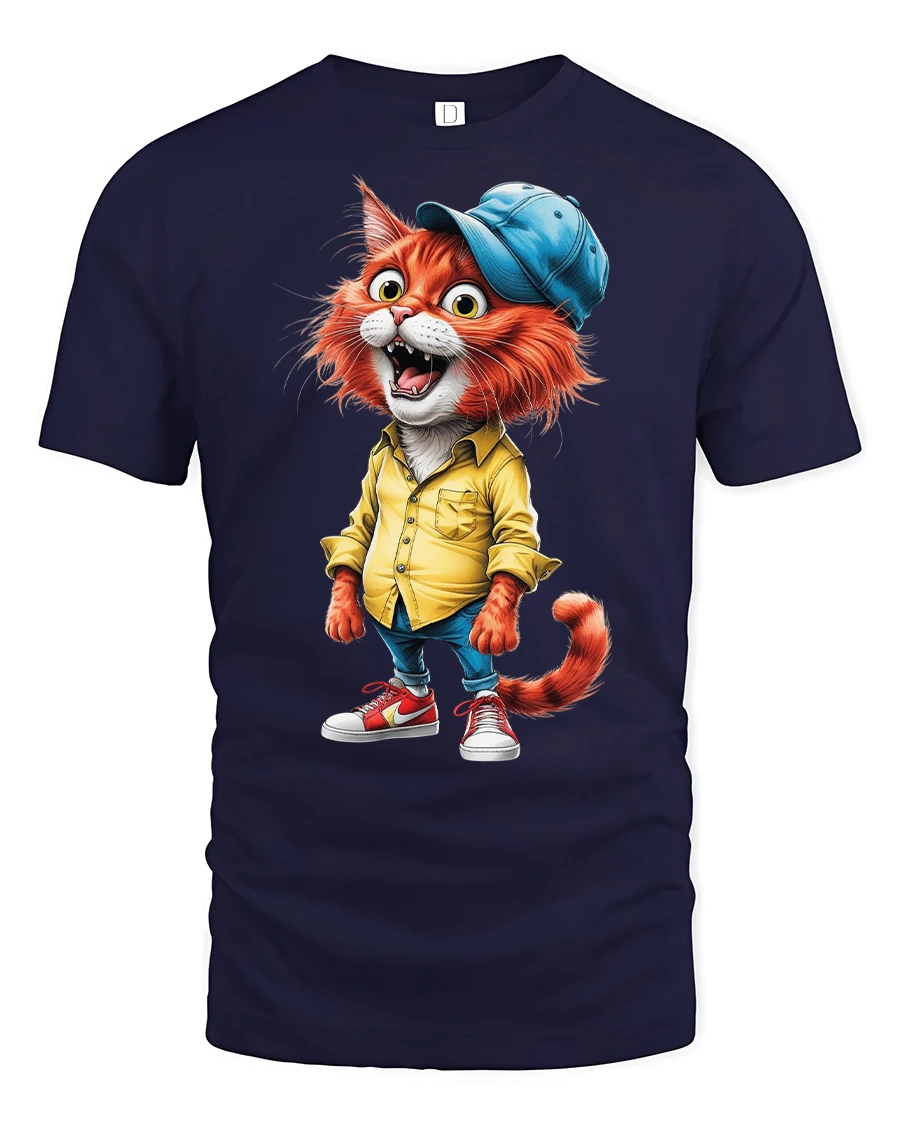 Cool Hipster Cat in Yellow Shirt Graphic T-Shirt is a fun and stylish choice for cat lovers who enjoy playful fashion. This eye-catching design features a bright red cartoon cat dressed in a yellow button-up shirt, jeans, sneakers, and a blue cap worn at an angle, giving off a laid-back streetwear vibe. The cat’s wide grin and expressive eyes add an extra layer of charm and humor to the artwork.