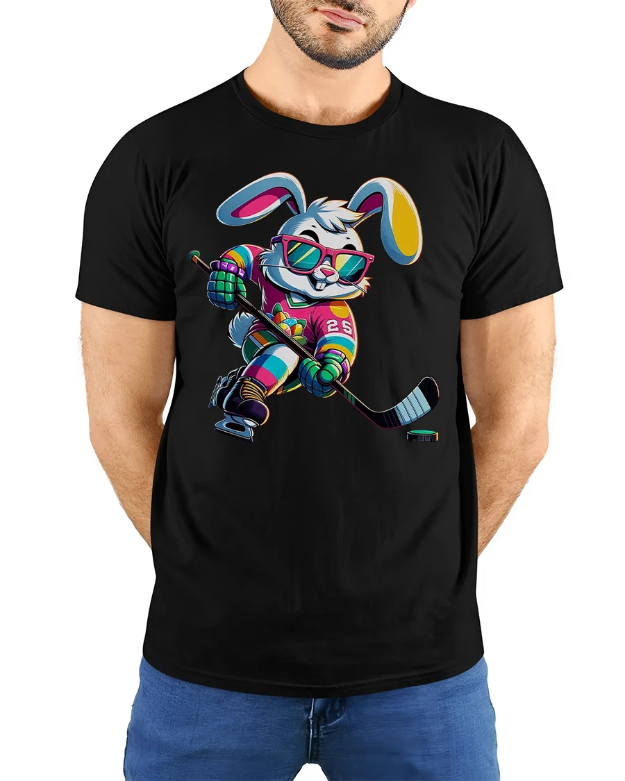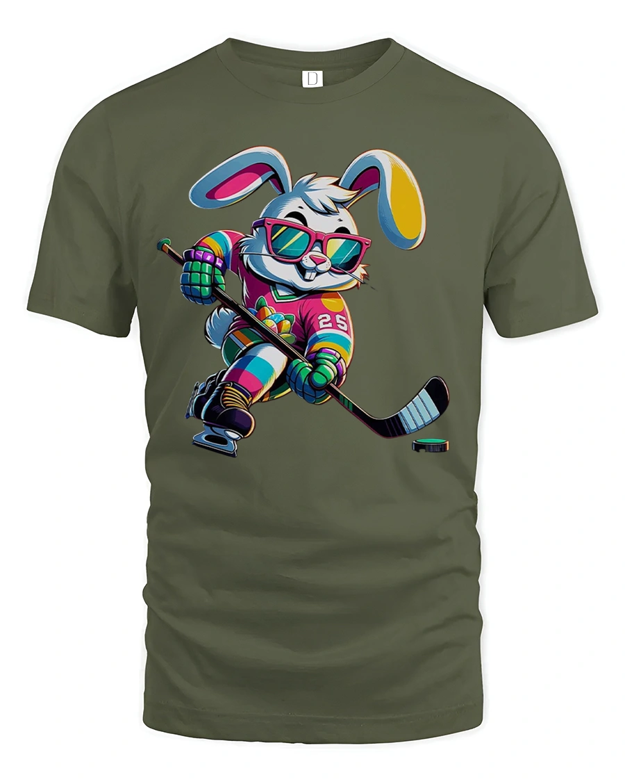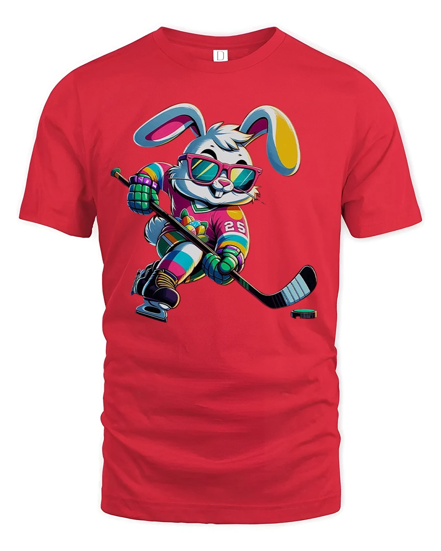 Featuring a stylish bunny in a neon hockey uniform, complete with shades and a confident grin, this tee is ideal for hockey fans who love bold and playful designs.