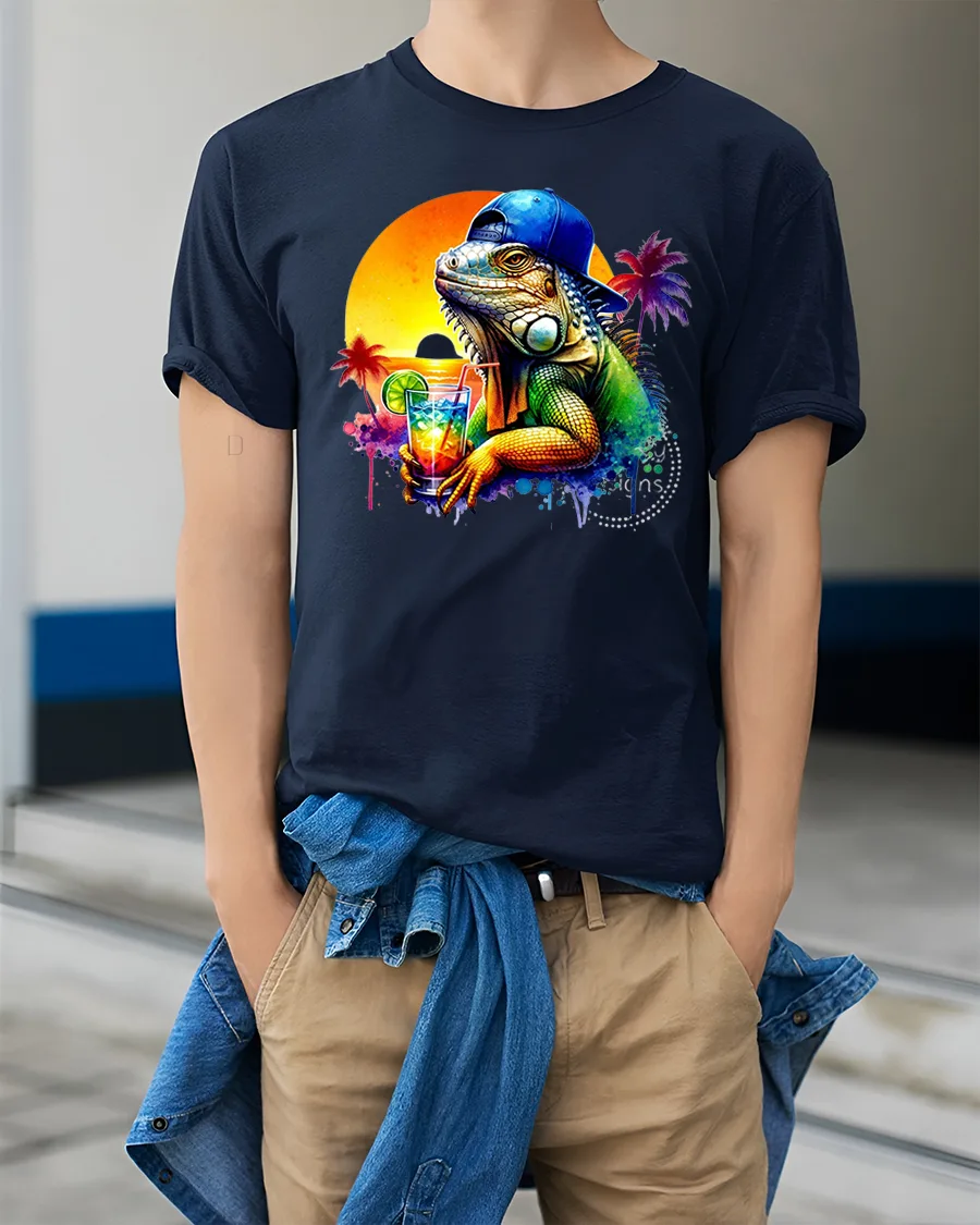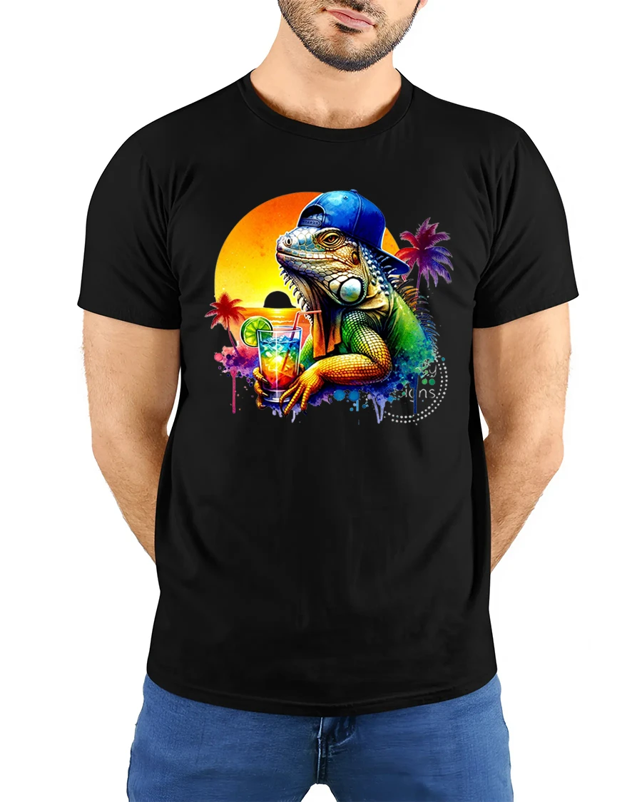 This eye-catching tee features a relaxed iguana rocking a blue cap and sipping a cocktail against a stunning sunset backdrop.