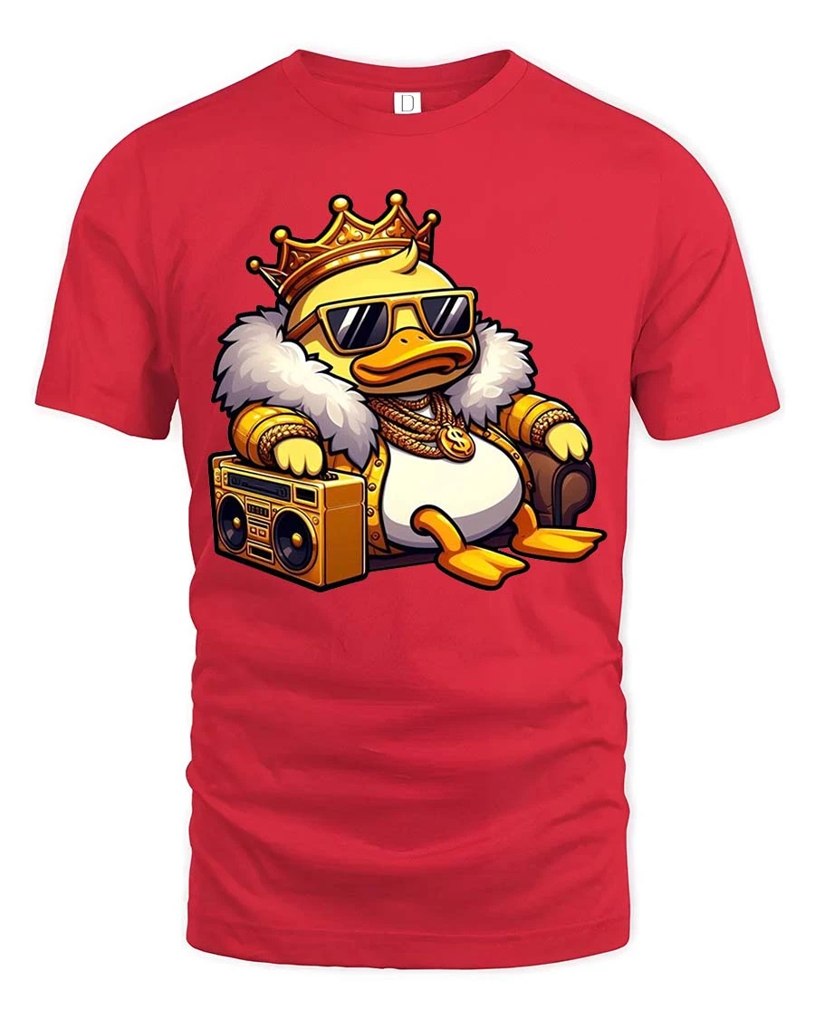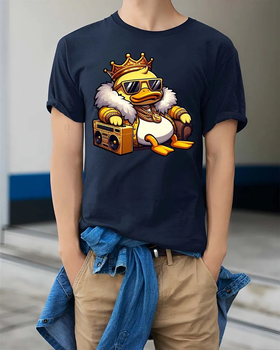 The Cool King Duck Boombox T-Shirt features a stylish cartoon duck dressed like a hip hop king, complete with a crown, sunglasses, gold chains, and a classic boombox. This playful design blends street culture with humorous cartoon style, creating a bold graphic tee that instantly stands out. The confident duck character gives the shirt a fun urban vibe that music lovers and streetwear fans will appreciate.