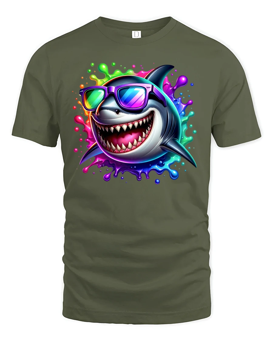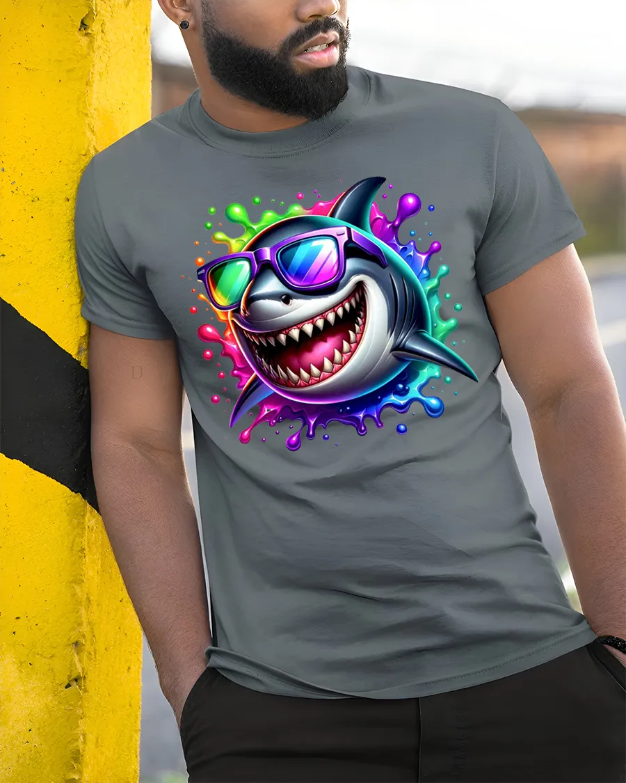 This vibrant tee features a grinning shark rocking rainbow shades, surrounded by a burst of neon colors that radiate pure fun and energy.