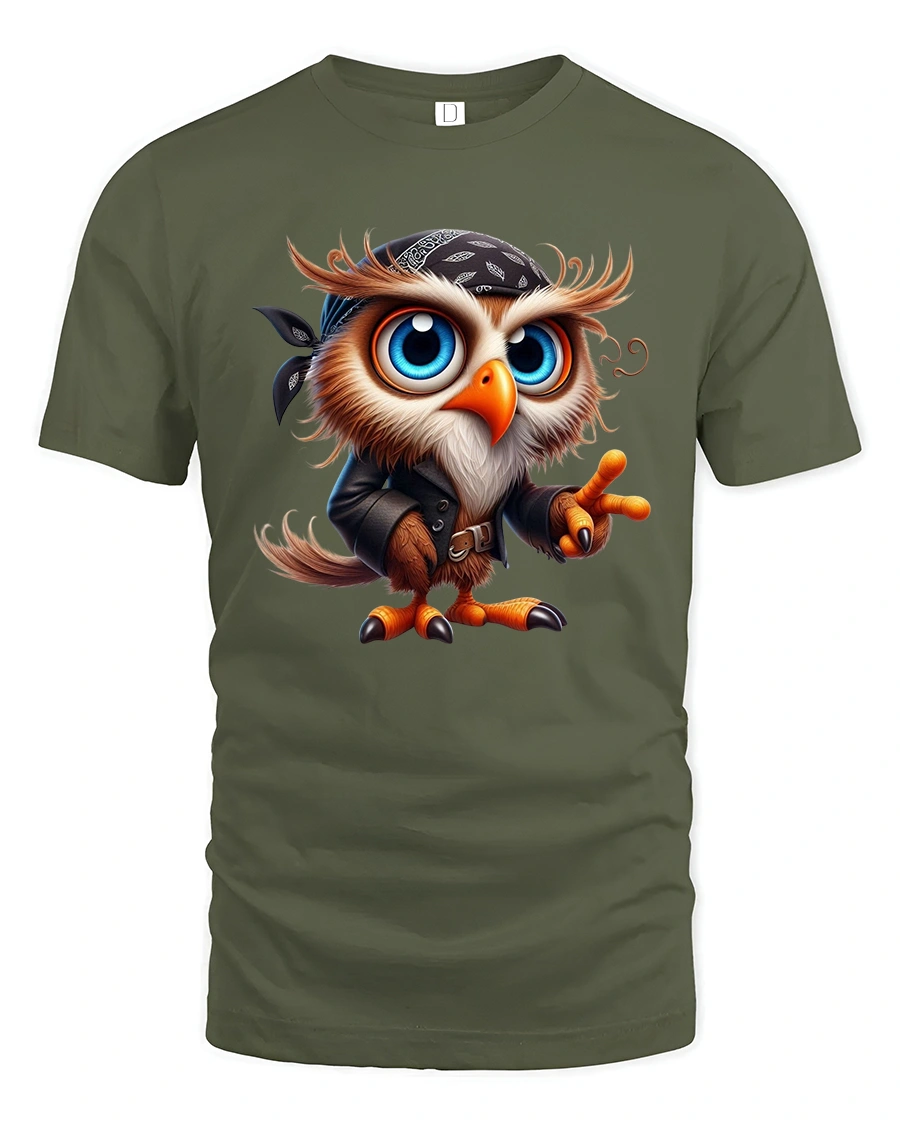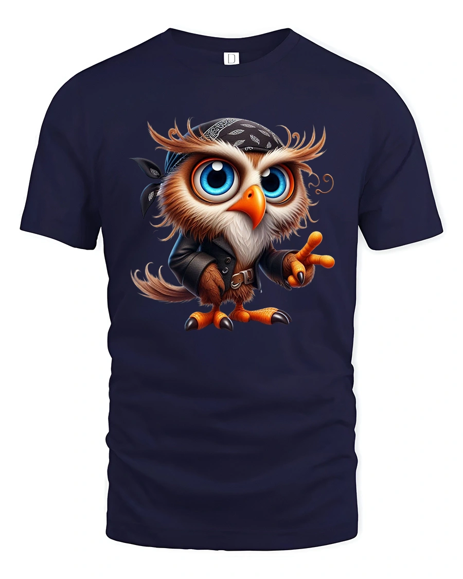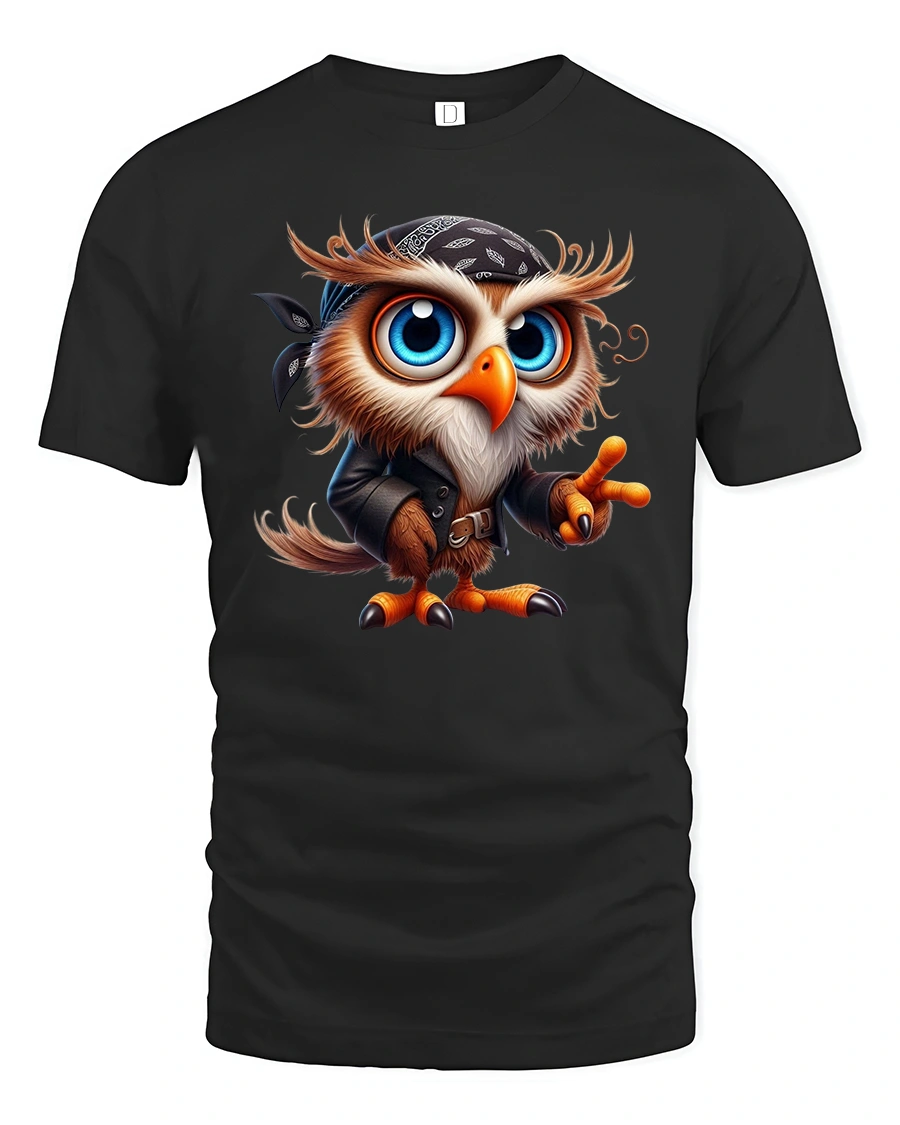 The design features a wide eyed owl dressed in a bandana and leather jacket striking a confident pose.