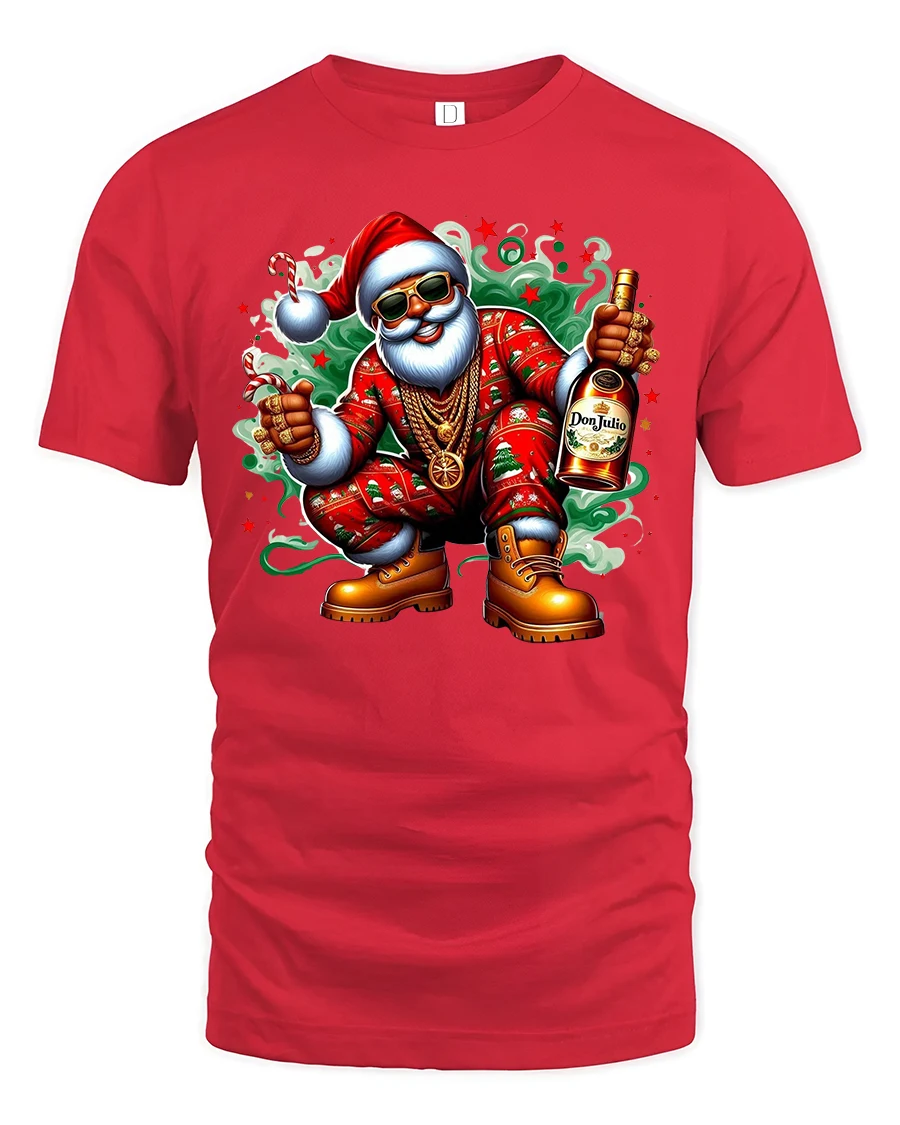 Cool Santa Party Vibes Christmas Tee with Fun Holiday Style brings a bold twist to classic holiday fashion. Featuring a stylish Santa dressed in vibrant red gear, gold chains, sunglasses, and boots, this design captures a confident and playful holiday spirit. The energetic artwork includes candy canes, stars, and smoky festive shapes that add personality and flair to the entire piece.
