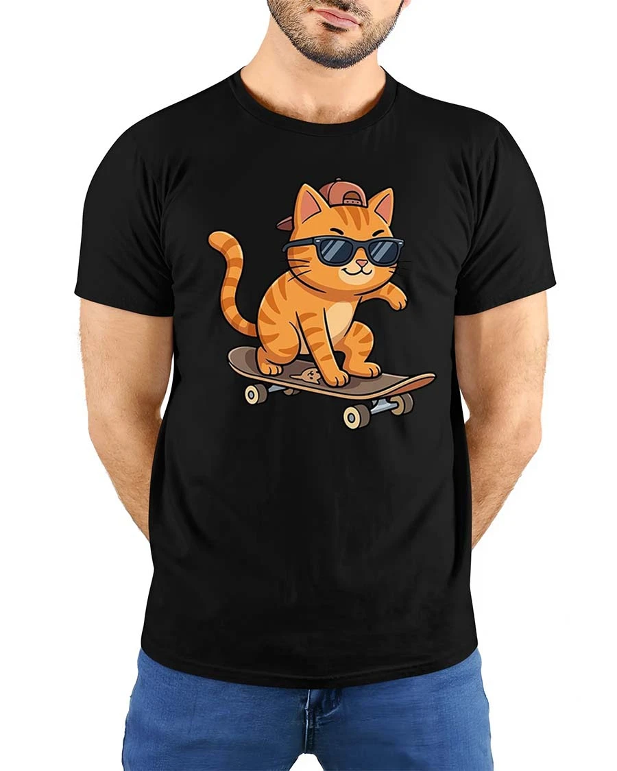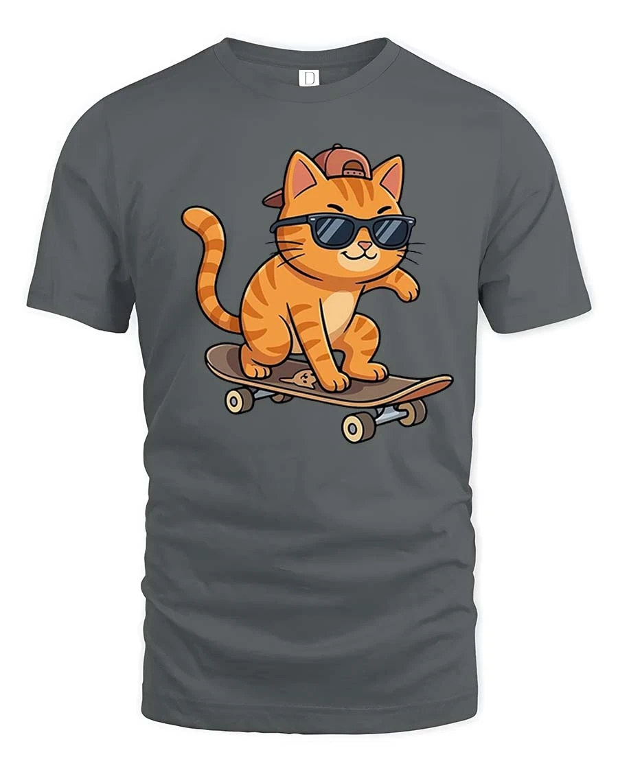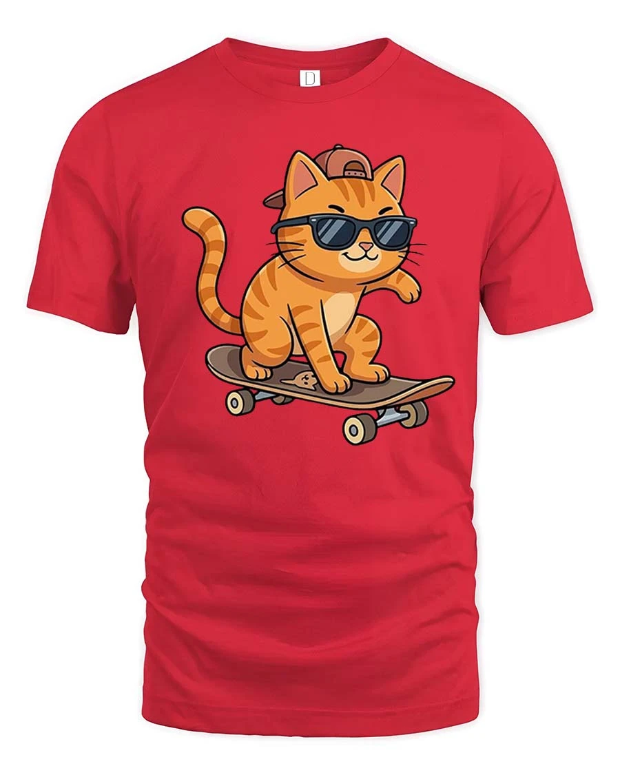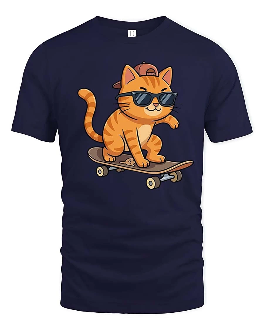 Featuring a laid-back cat riding a skateboard with sunglasses and a cap, this t-shirt captures a cool street vibe.