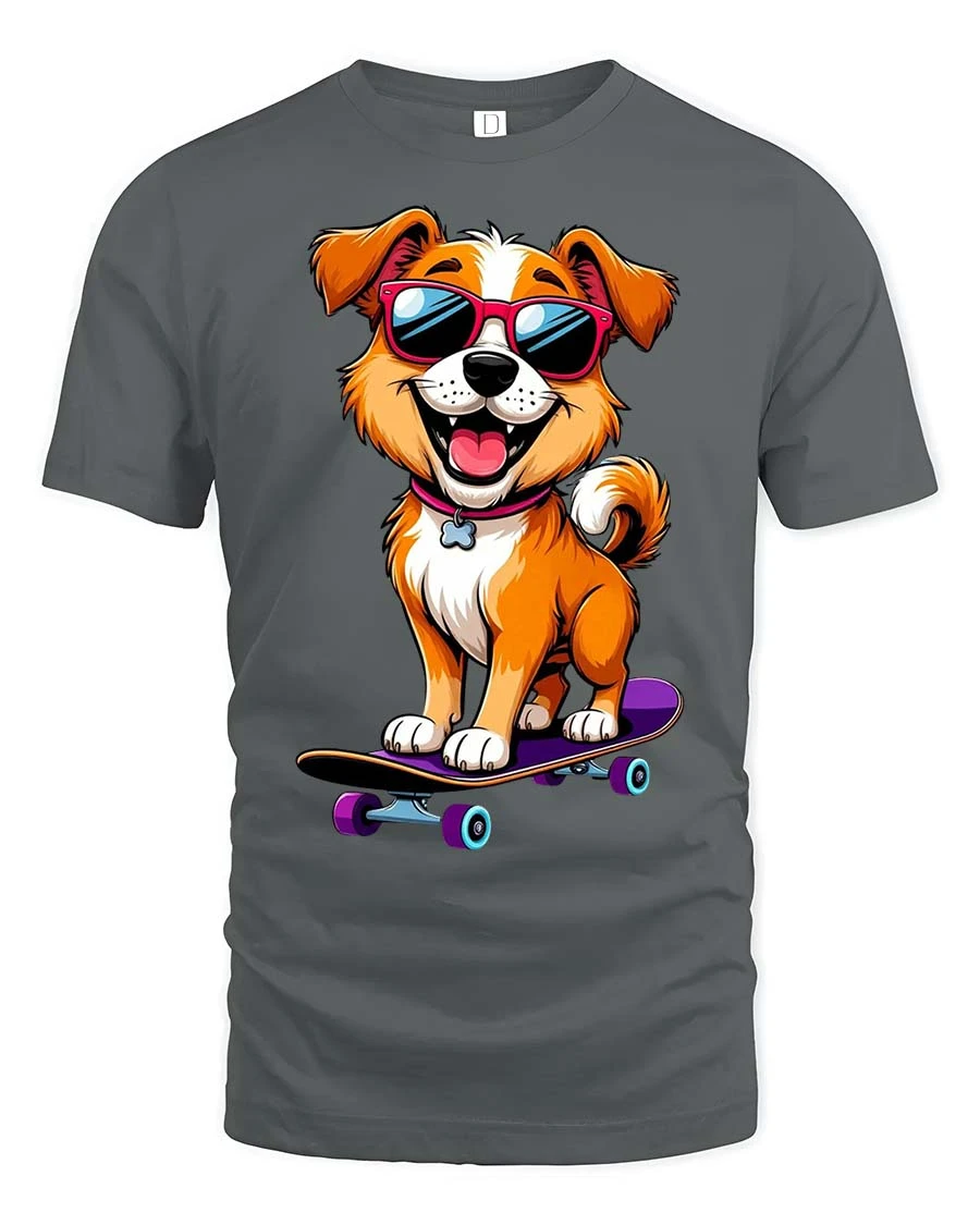 Featuring an adorable dog riding a skateboard with sunglasses, this playful design adds personality and energy to any outfit.