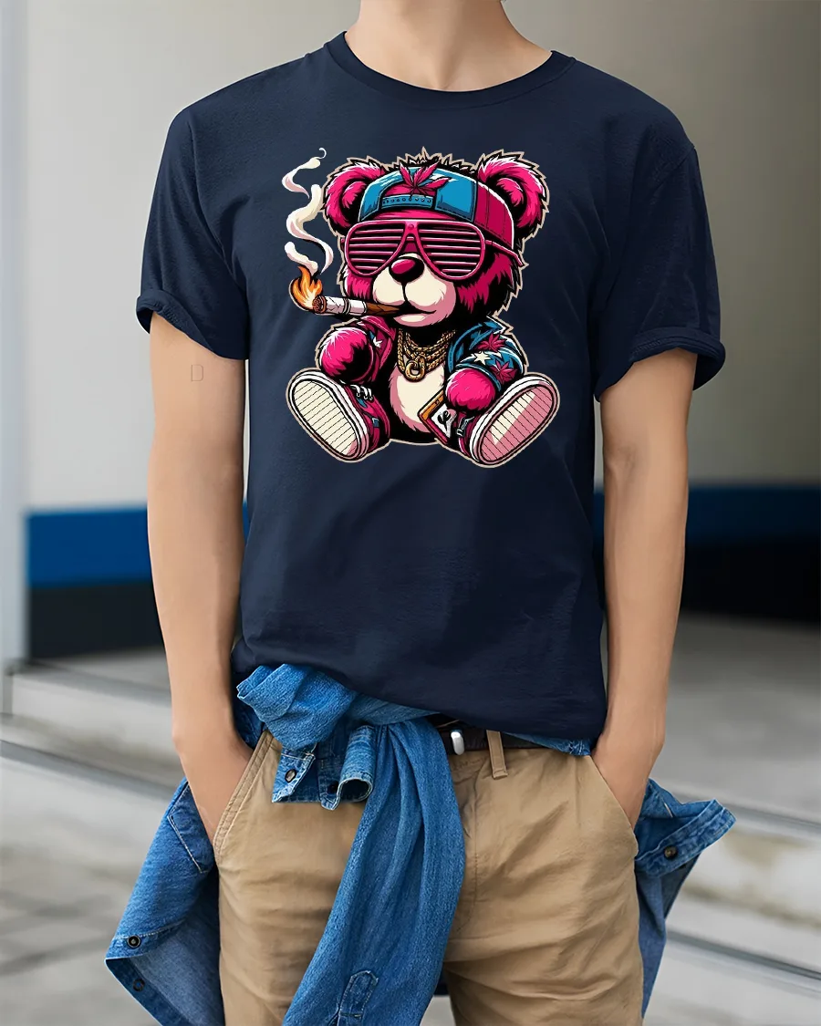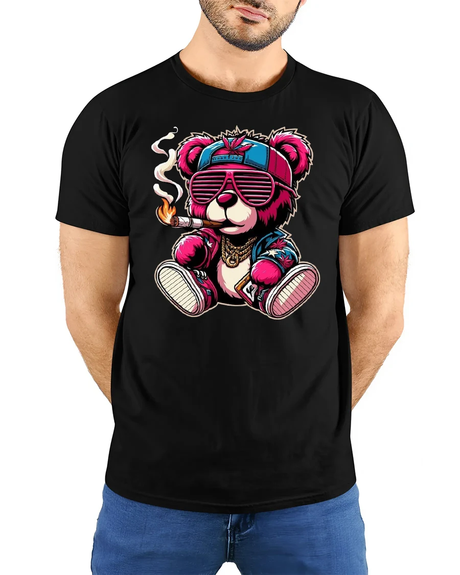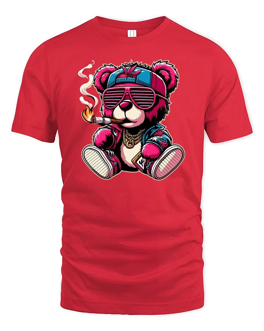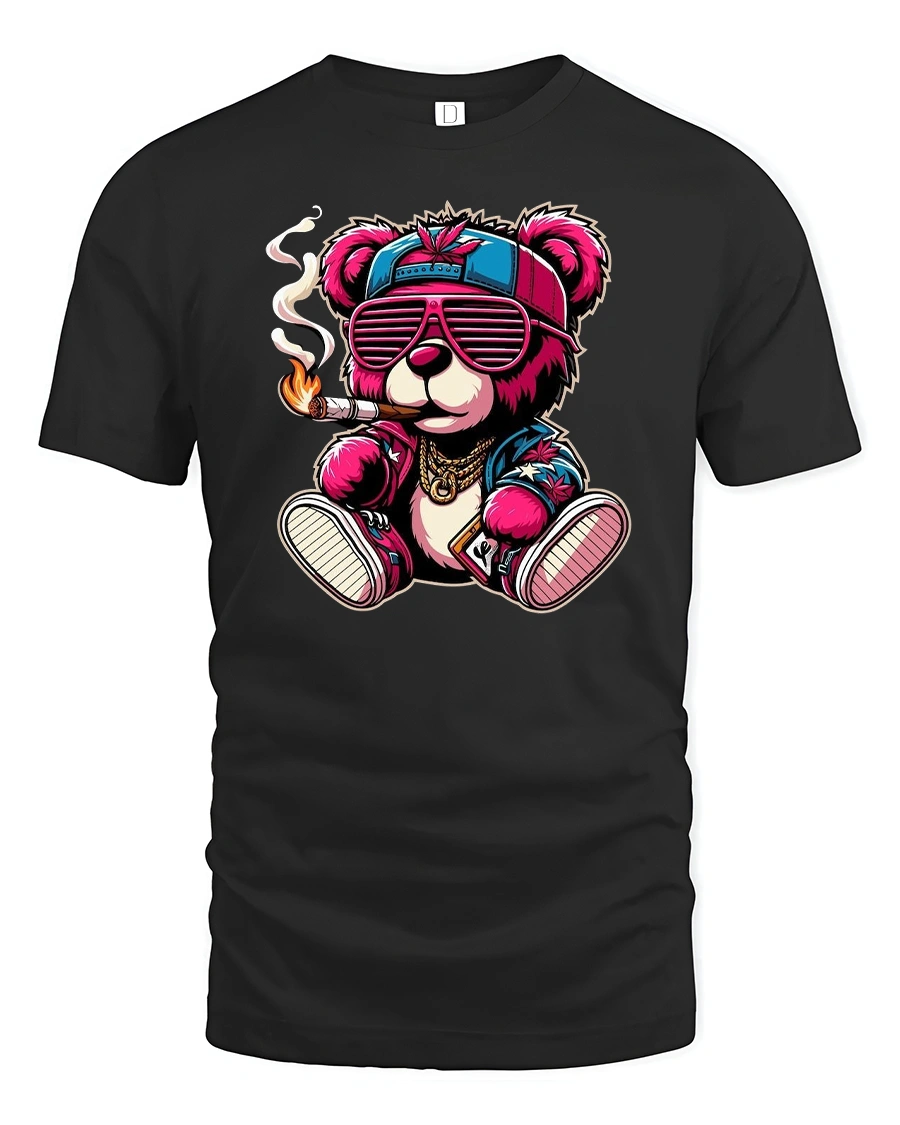 The vibrant print captures every detail — from the bear’s hat and glasses to the smoking pose — giving you a standout piece for casual outings, parties, or hip hop events.