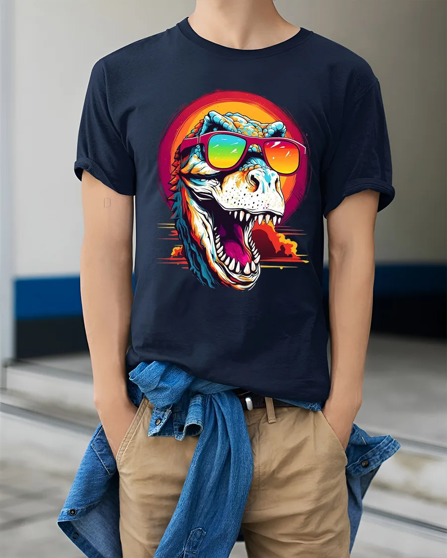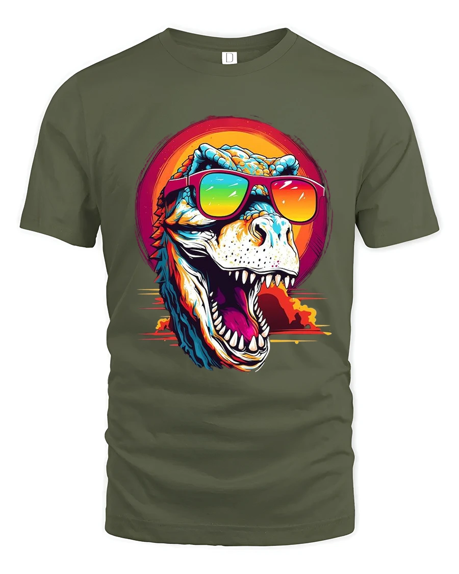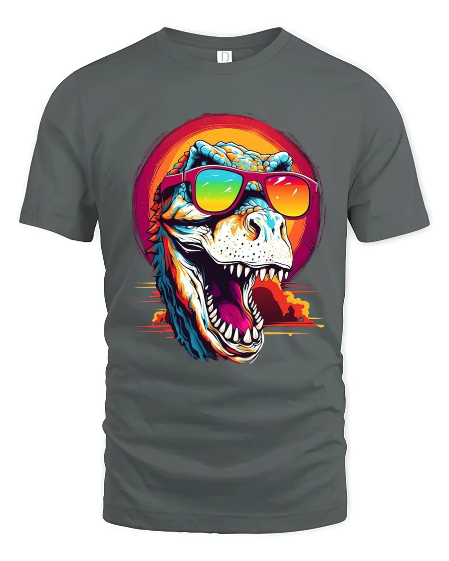 The Cool Sunglasses T Rex Roar Graphic Tee With Retro Sunset Vibes blends humor and confidence in a fresh modern style.