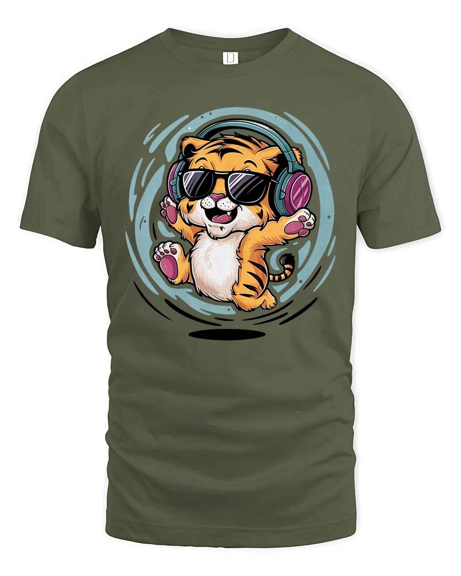 Cool Tiger Listening Music Funny Cartoon Animal Graphic Tshirt - military green t-shirt on white background