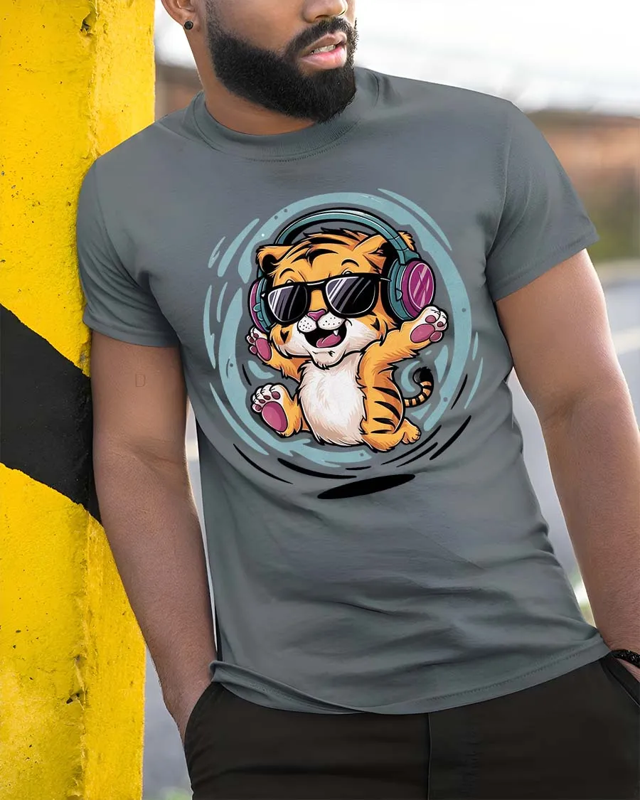 Cool Tiger Listening Music Funny Cartoon Animal Graphic Tshirt - model wearing grey tee, leaning on column