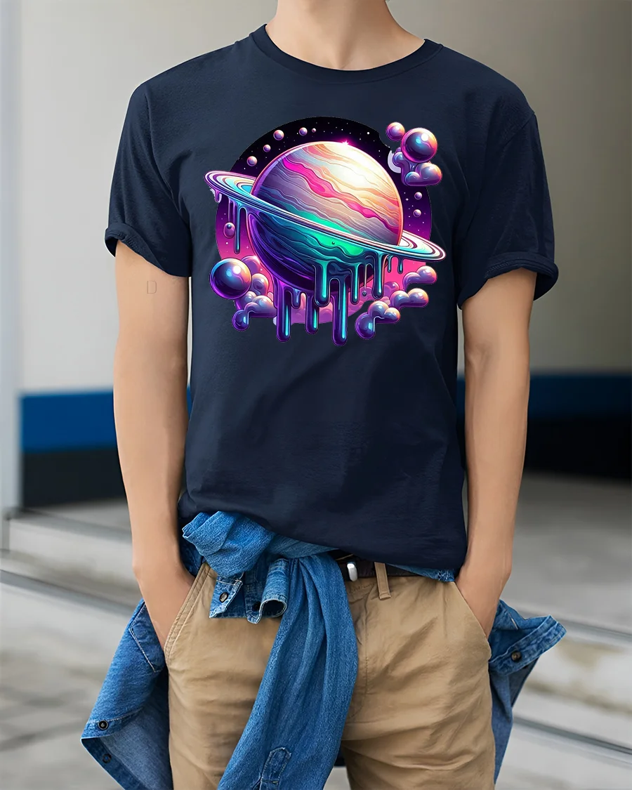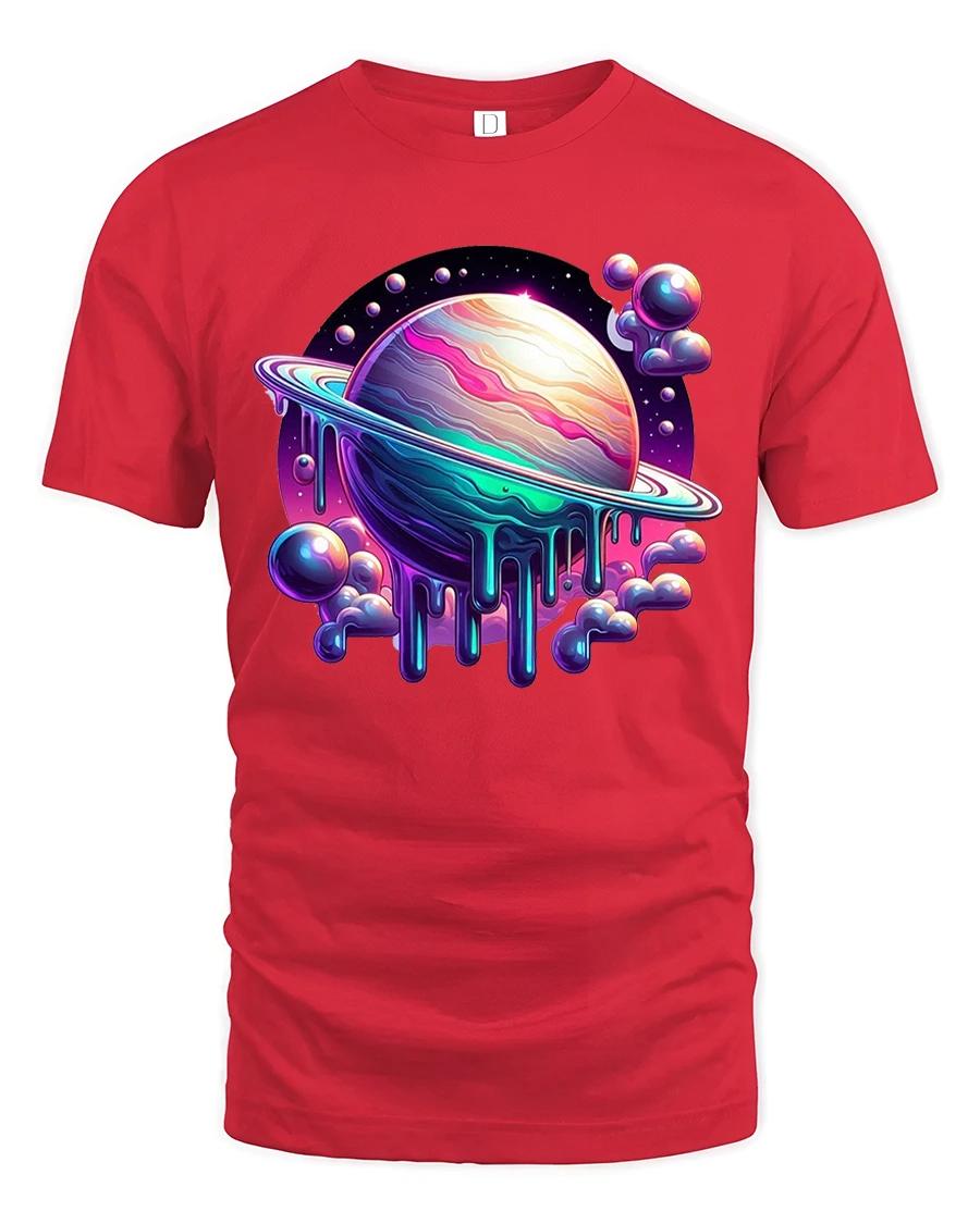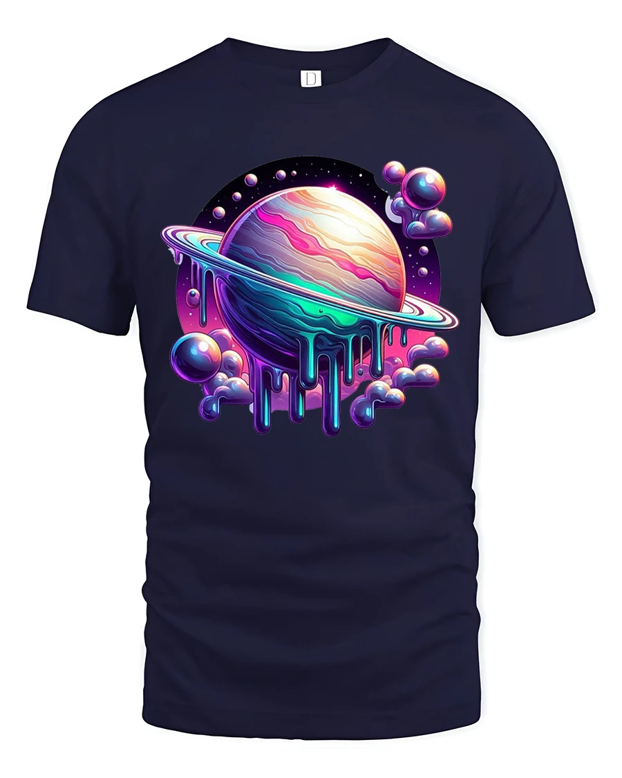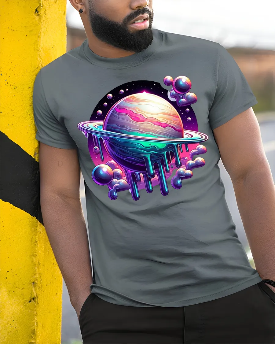 This cosmic planet t shirt features a surreal melting planet surrounded by glowing colors floating clouds and deep galaxy tones.
