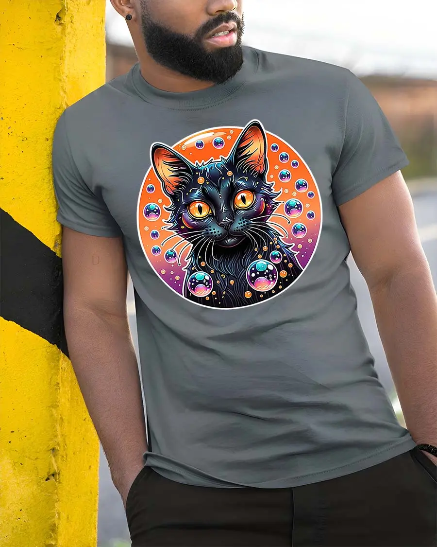 Cosmic Neon Black Cat Bubble Galaxy Graphic Art Tshirt brings a bold and futuristic style that stands out in any casual wardrobe.