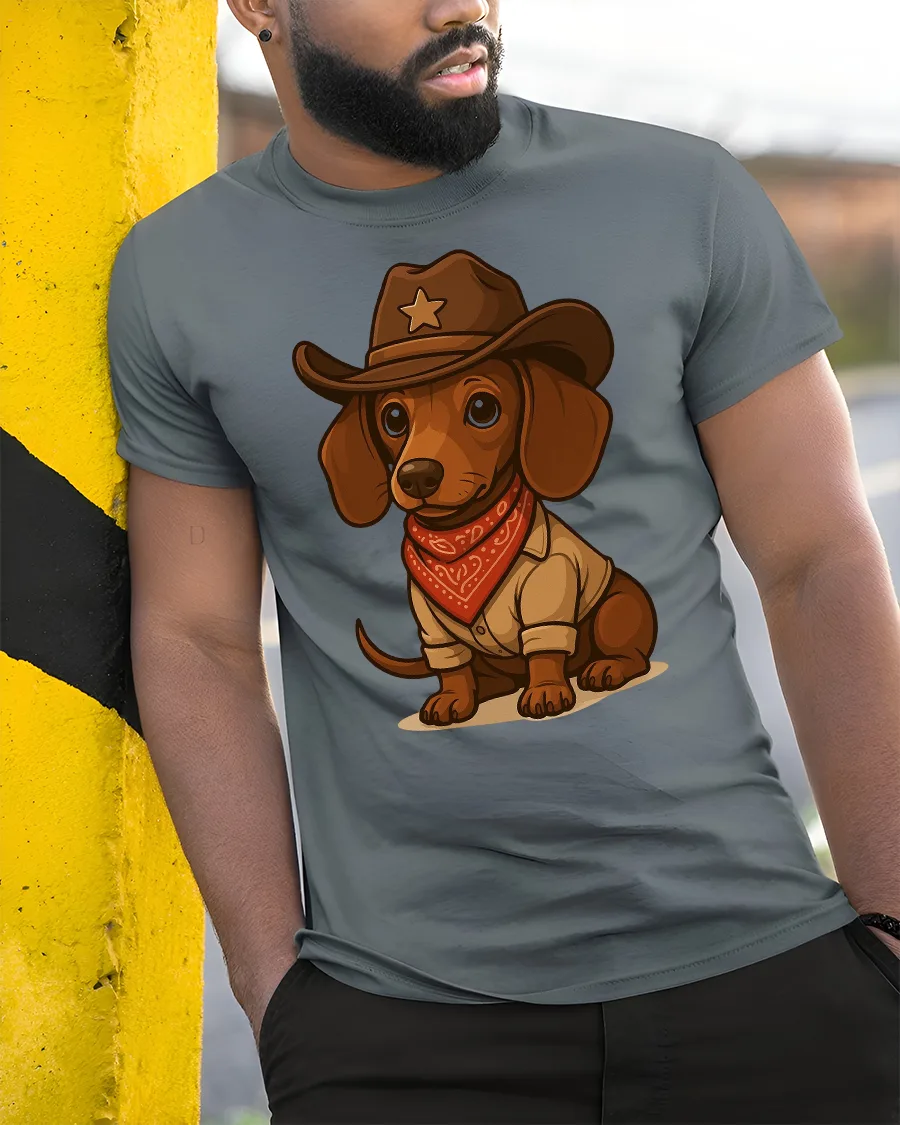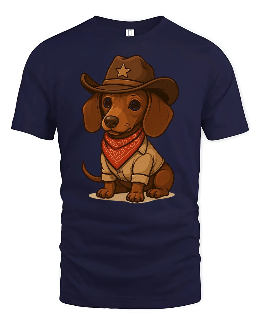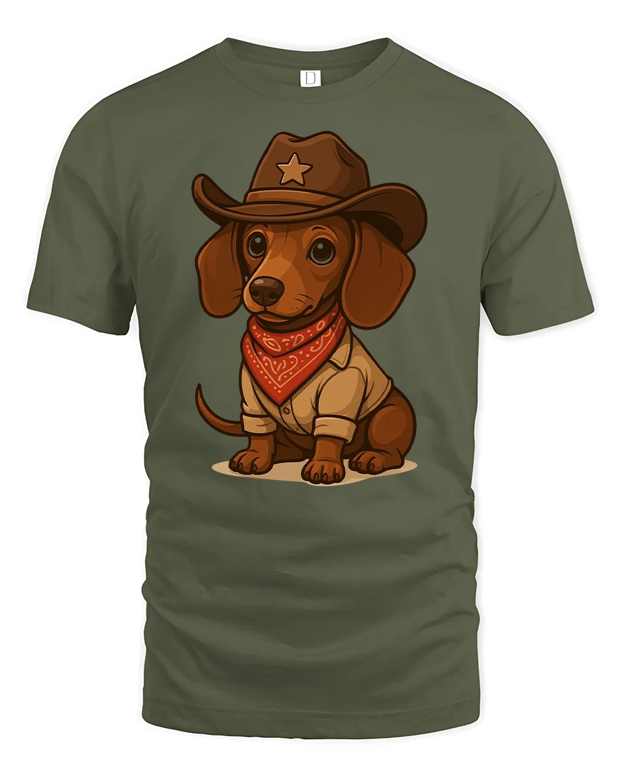 Featuring a cute dachshund dressed as a cowboy sheriff with a hat and red bandana, this tee is perfect for anyone who loves dogs and western style.