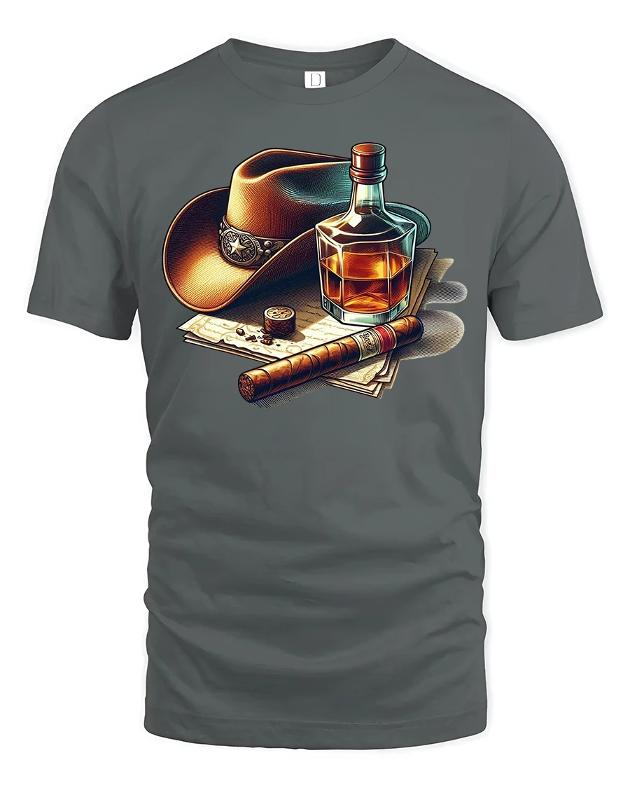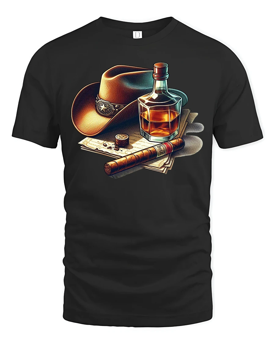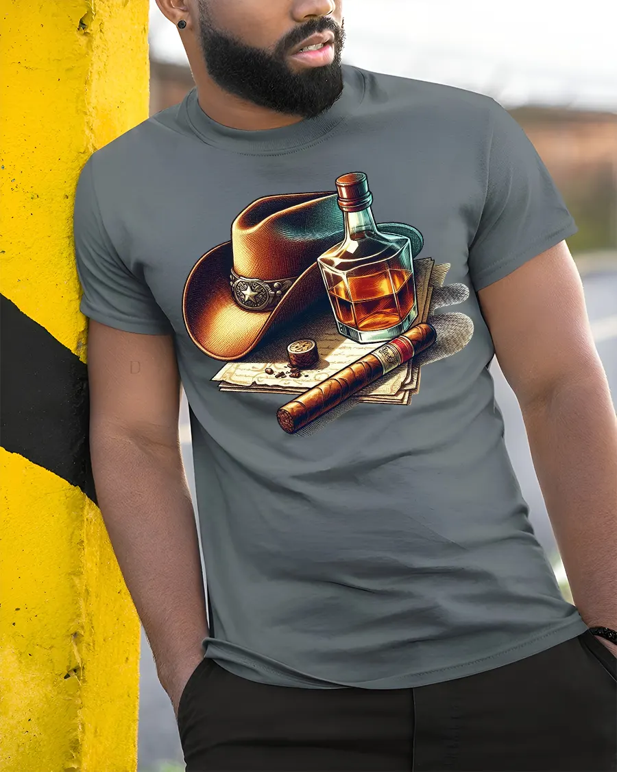 Featuring a striking design of a cowboy hat, a glass of whiskey, and a fine cigar, this shirt brings out classic charm and masculine energy in a stylish way.