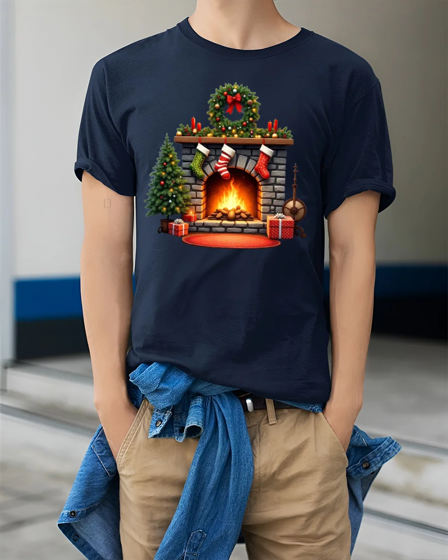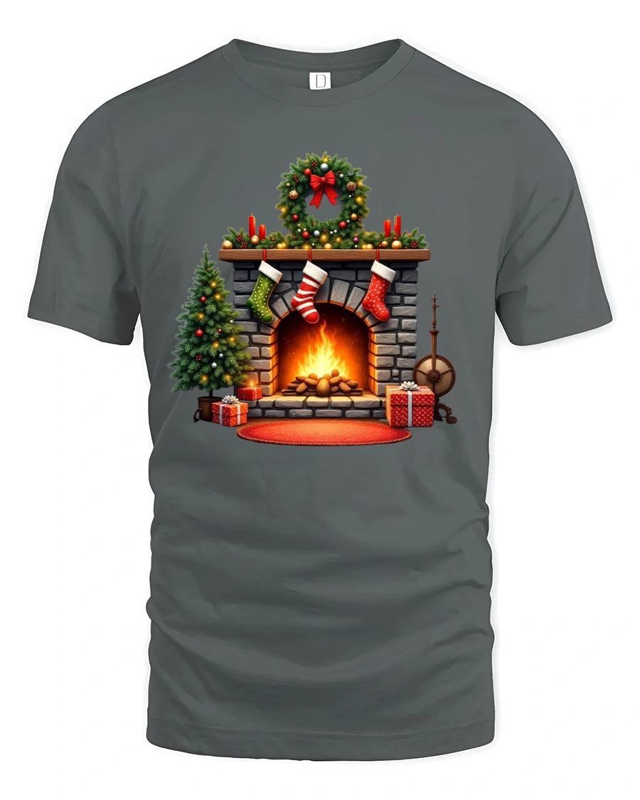 Featuring a beautifully detailed fireplace scene with glowing flames, stockings, wreaths, and Christmas decorations, this graphic t shirt delivers a cozy holiday feeling that instantly reminds you of home, family, and joyful winter nights.