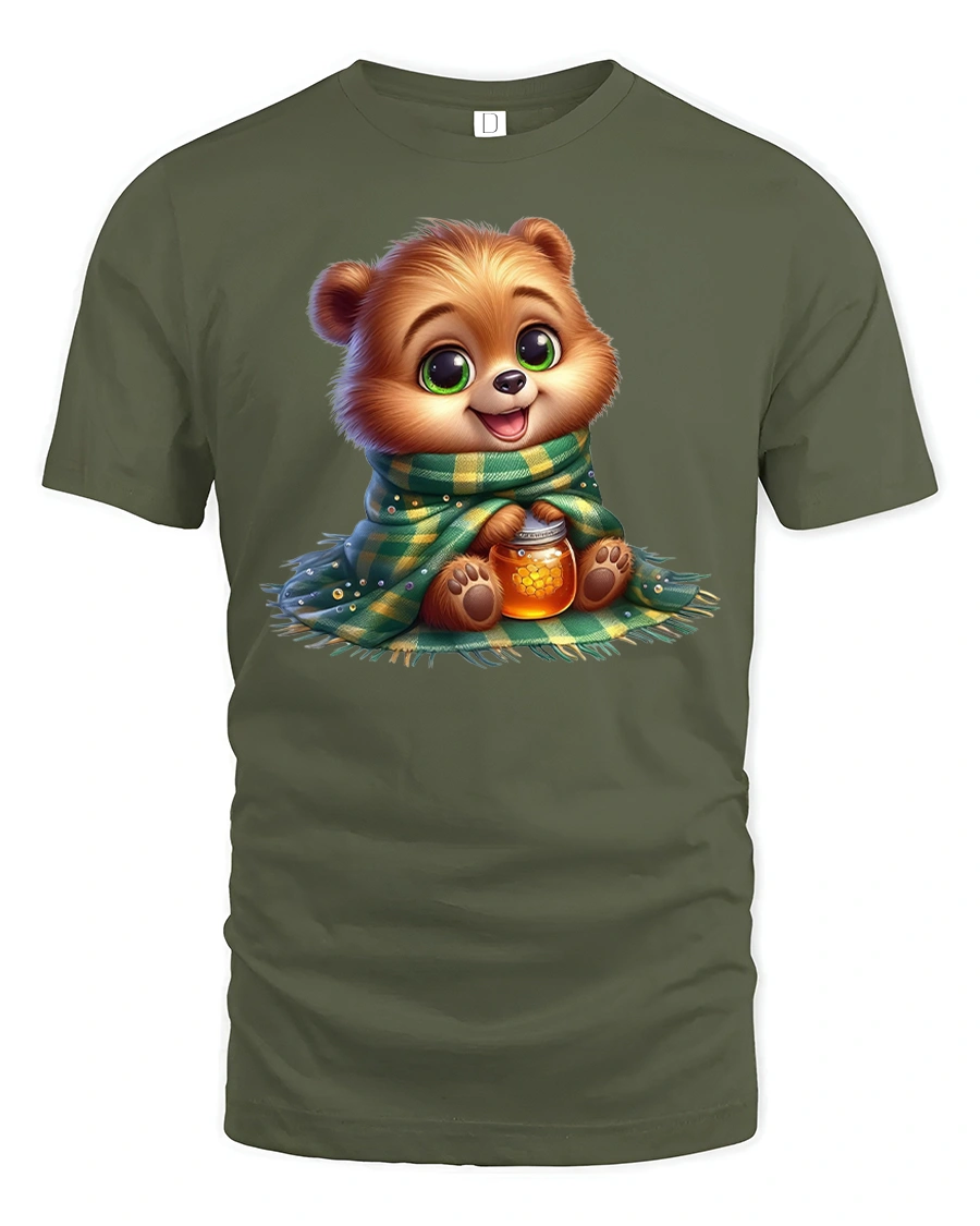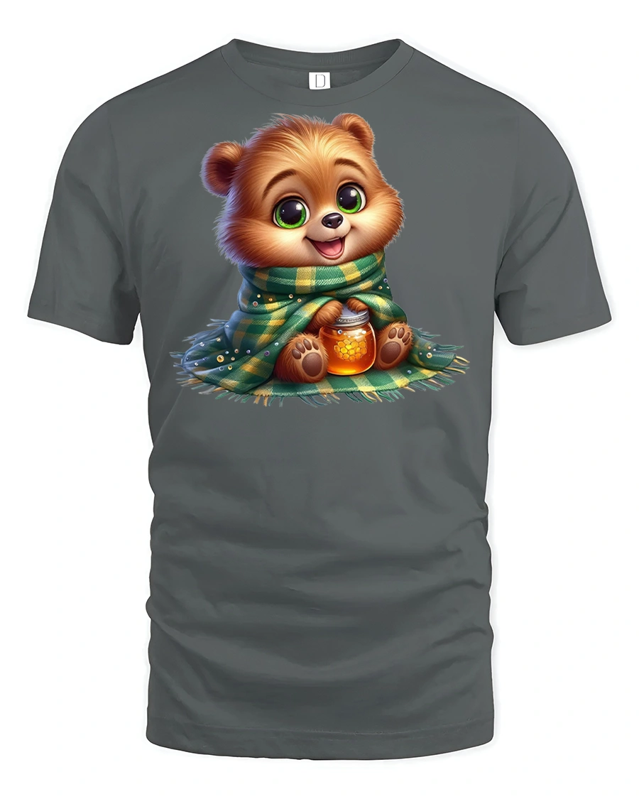 Featuring a cuddly baby bear wrapped in a soft plaid blanket and holding a glowing jar of honey, this tee brings out the charm of cozy comfort and sweetness.