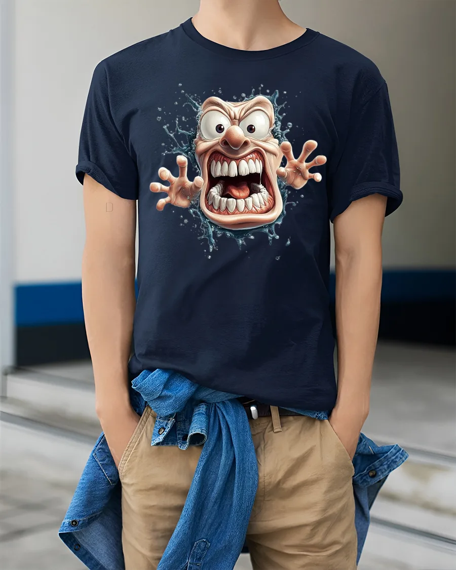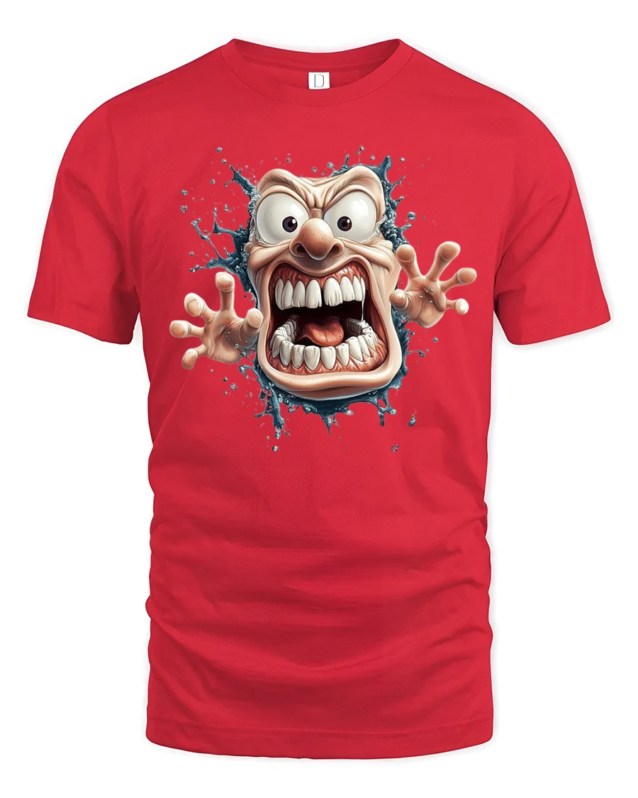 This Crazy Cartoon Face Tee with Wild Screaming Character Art delivers big laughs and bold personality with every wear. The design features an exaggerated screaming face bursting outward with huge eyes, oversized teeth, and expressive hands reaching forward, giving the artwork a lively and energetic 3D effect. The dynamic splash design surrounding the character adds motion and visual excitement that instantly grabs attention.