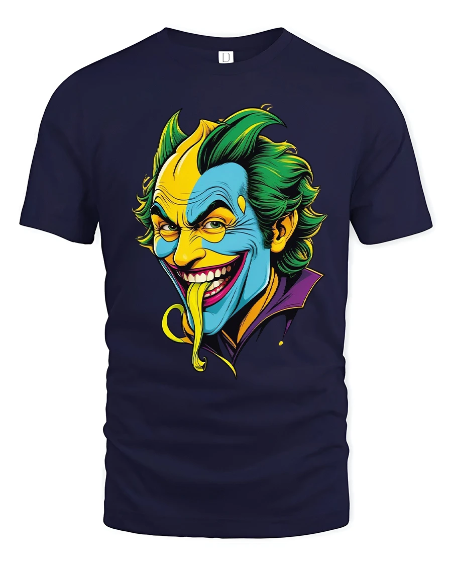 The Crazy Grinning Villain Cartoon Face Graphic Tee Bold Color Tshirt delivers a striking comic inspired look with an exaggerated smile and vivid colors.