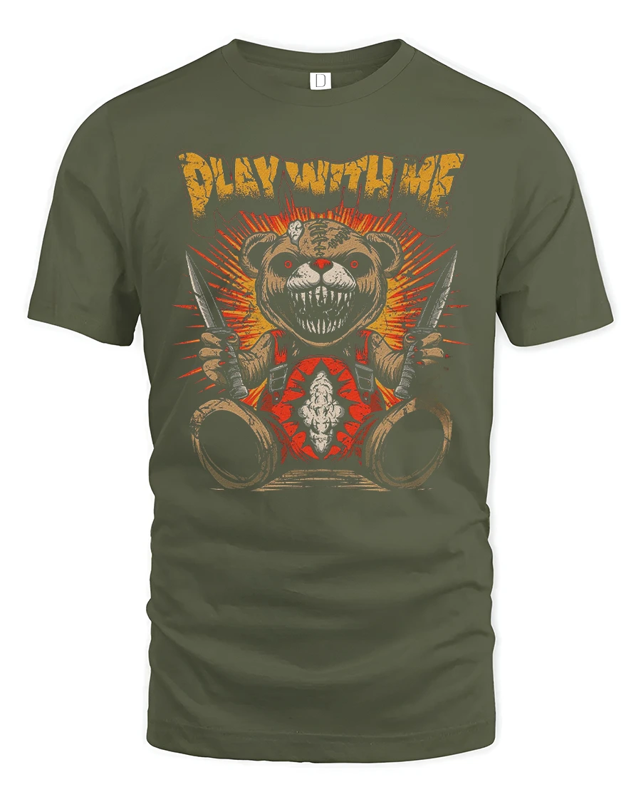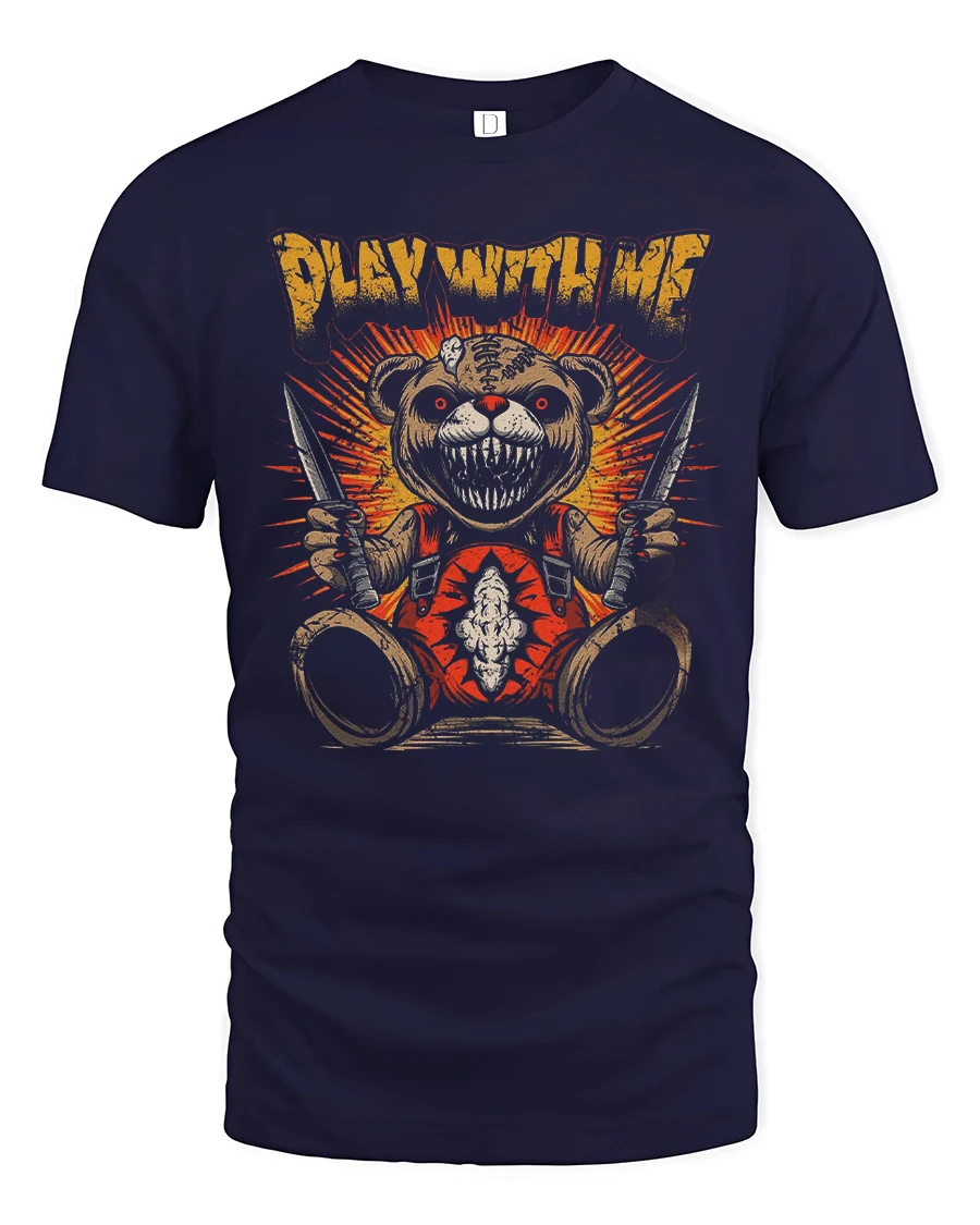 The Creepy Play With Me Horror Teddy Bear Graphic Tshirt Art delivers a bold and intense design that blends dark humor with striking visual impact.