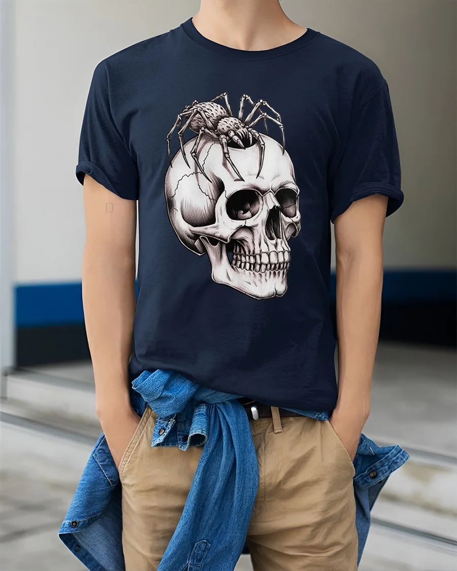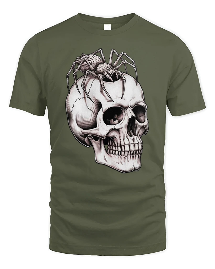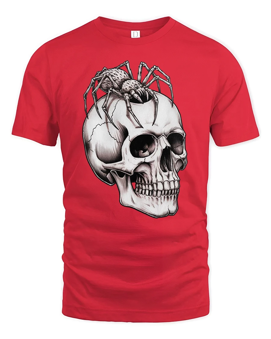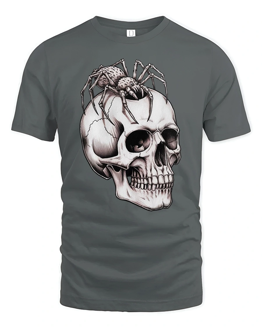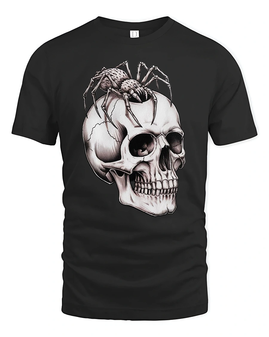 The design blends classic gothic themes with modern artistry, making it an ideal choice for those who enjoy horror, macabre style or bold statement pieces. The spider perched on the cracked skull adds an intense level of detail and symbolism, representing fearlessness, mystery and the darker side of creativity. This tee pairs easily with casual outfits, concert looks or alternative streetwear styles.