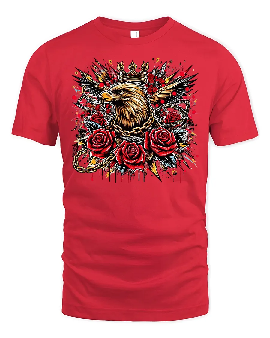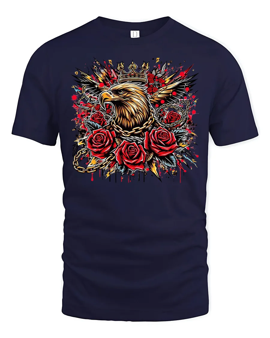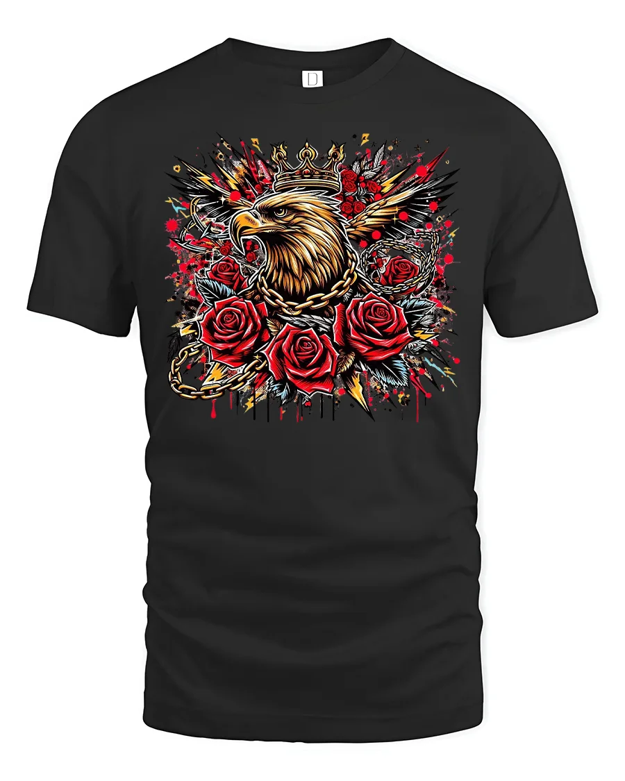 Crowned Eagle with Roses Graphic T-Shirt for Men is a bold and powerful design that symbolizes strength, royalty, and passion. The detailed artwork features a fierce eagle wearing a golden crown, surrounded by red roses and golden chains, all set against a splash of vibrant street-art style colors. This striking combination of nature and royalty makes it a true statement piece for anyone who loves standout graphic tees.