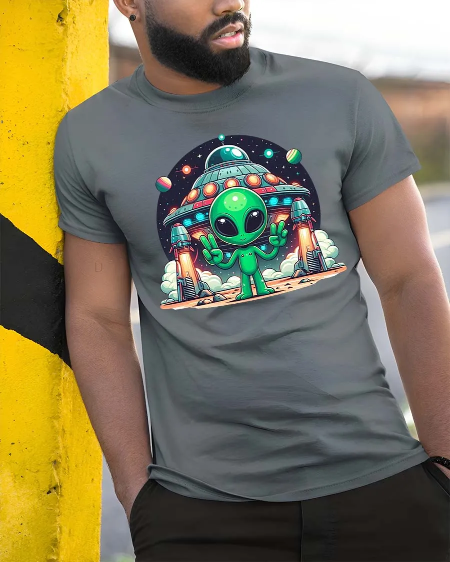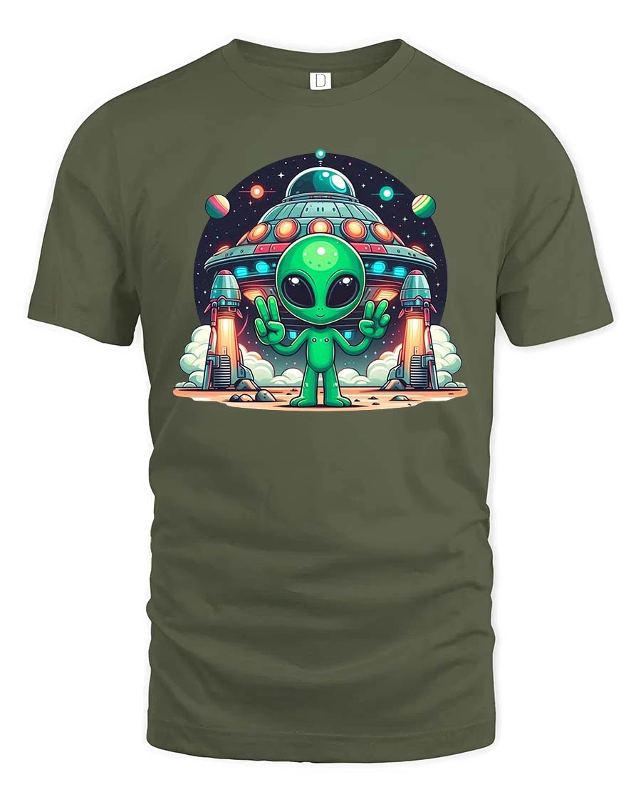 Cute Alien UFO Space Cartoon Sci Fi Graphic T-Shirt Tee features an imaginative character that brings fun cosmic creativity into everyday fashion.