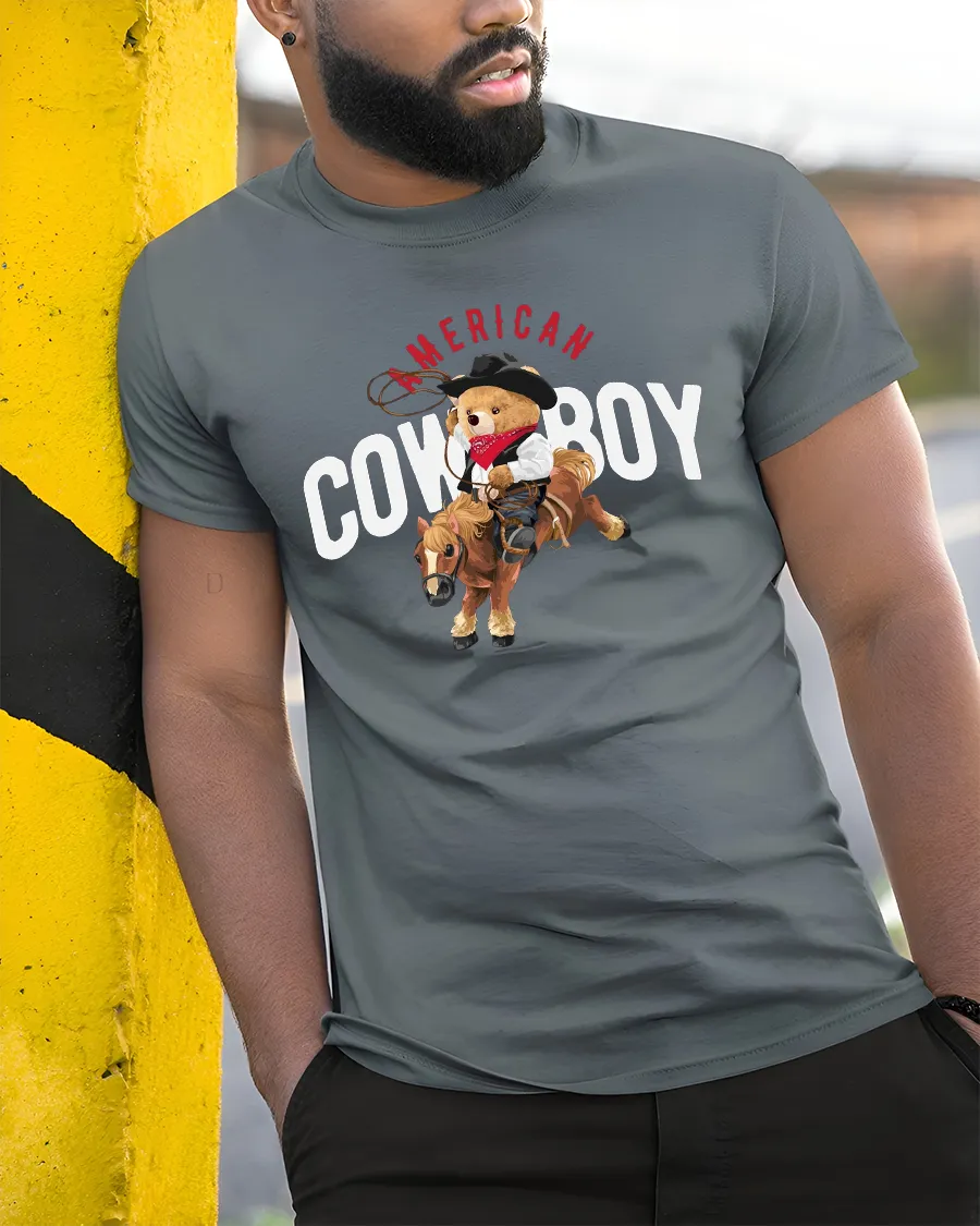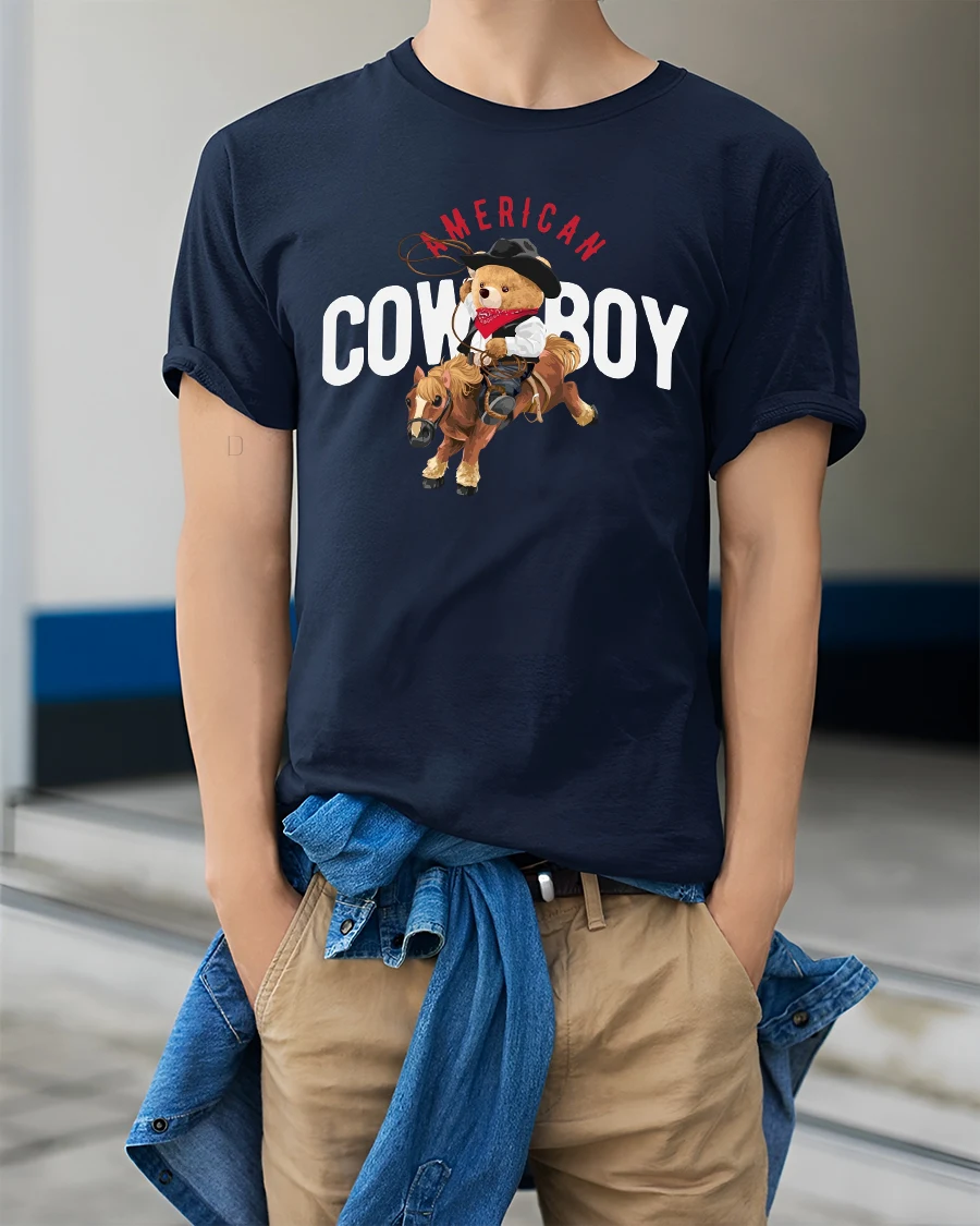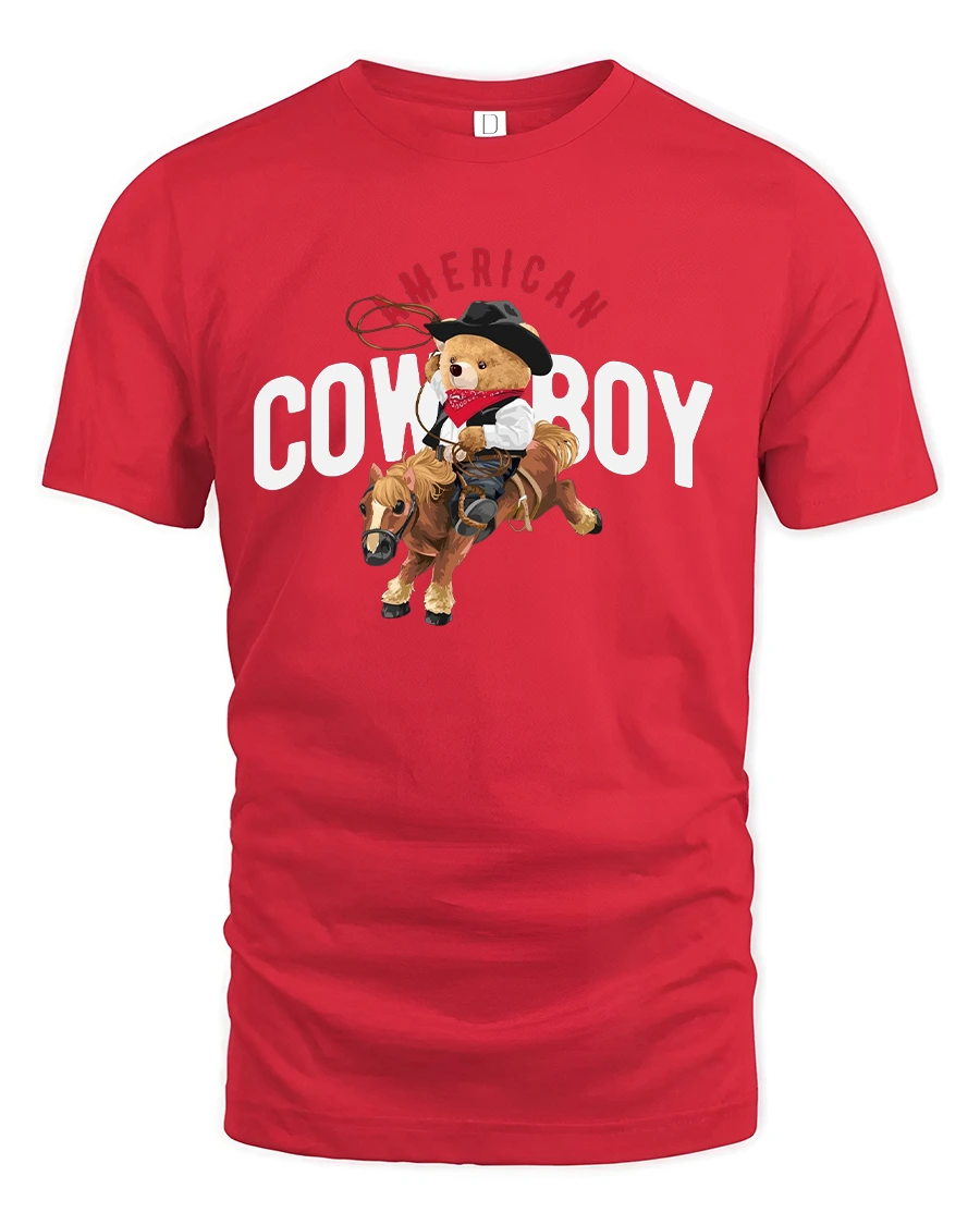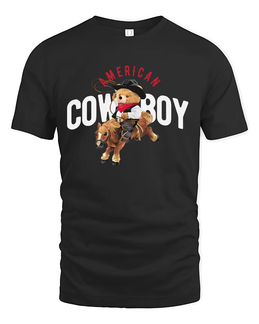 Cute American Cowboy Bear Tee Riding Horse in Fun Western Style brings together adorable charm and classic country spirit. The design features a cute teddy bear dressed in full cowboy gear—complete with hat, boots, lasso, and a bandana—riding confidently atop a galloping horse. The bold “American Cowboy” text adds a touch of Western pride, making this tee perfect for fans of rodeos, horses, and playful cowboy-themed artwork.