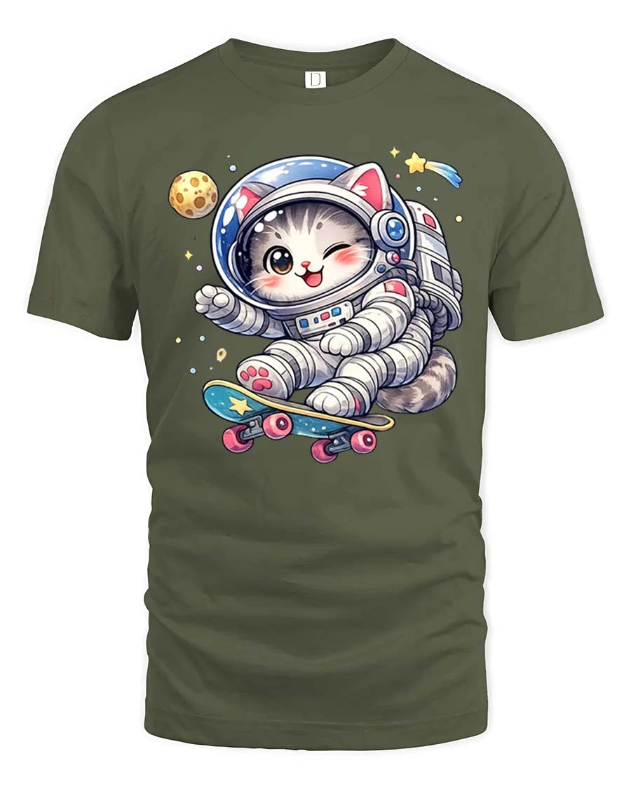 The Cute Astronaut Cat Skateboard Space T-Shirt features an adorable cartoon kitty astronaut riding a skateboard through space.